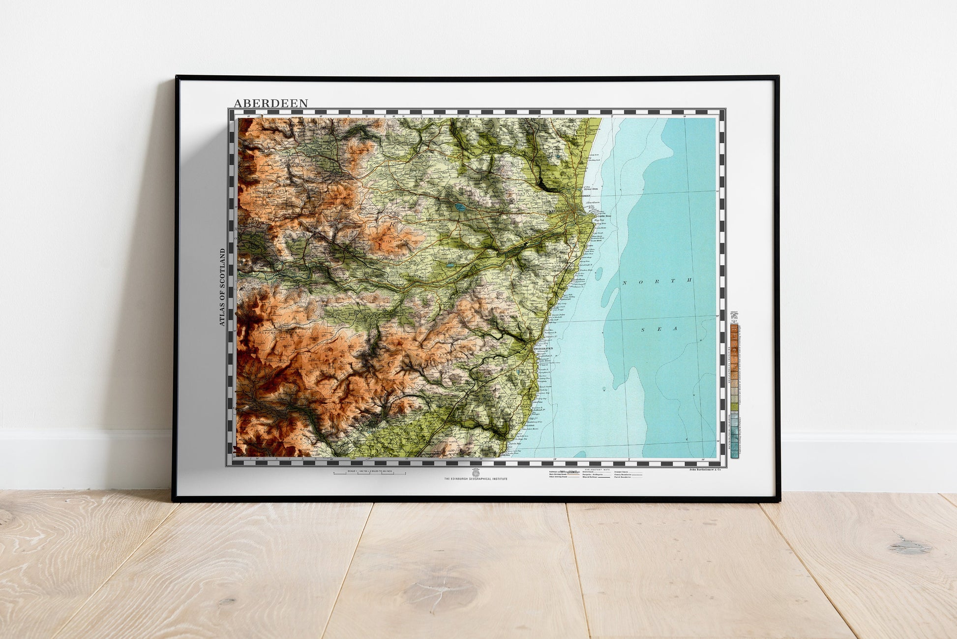 Aberdeen MapThis is a 2D fine art print of a restored vintage 1912 Bartholomew map of Aberdeen. It is created using advanced digital shading techniques, merging old vintage maps with modern satellite elevation data. Please note, these prints are 2-dimensional, which means they are flat to the touch (they aren't made using a 3D printer). The shadows pictured in the advertised images will also be present in the final print. These are added to give the appearance of a 3 dimensional structure.Also, it is worth noting that some text may not be legible in the print due to the size of the text or the shadowing. This is especially true in the more mountainous terrain where shadowing is more profound. These maps are visually stunning and make for a great wall art, but are not intended to be used as an educational/reference resource.PLEASE NOTE: