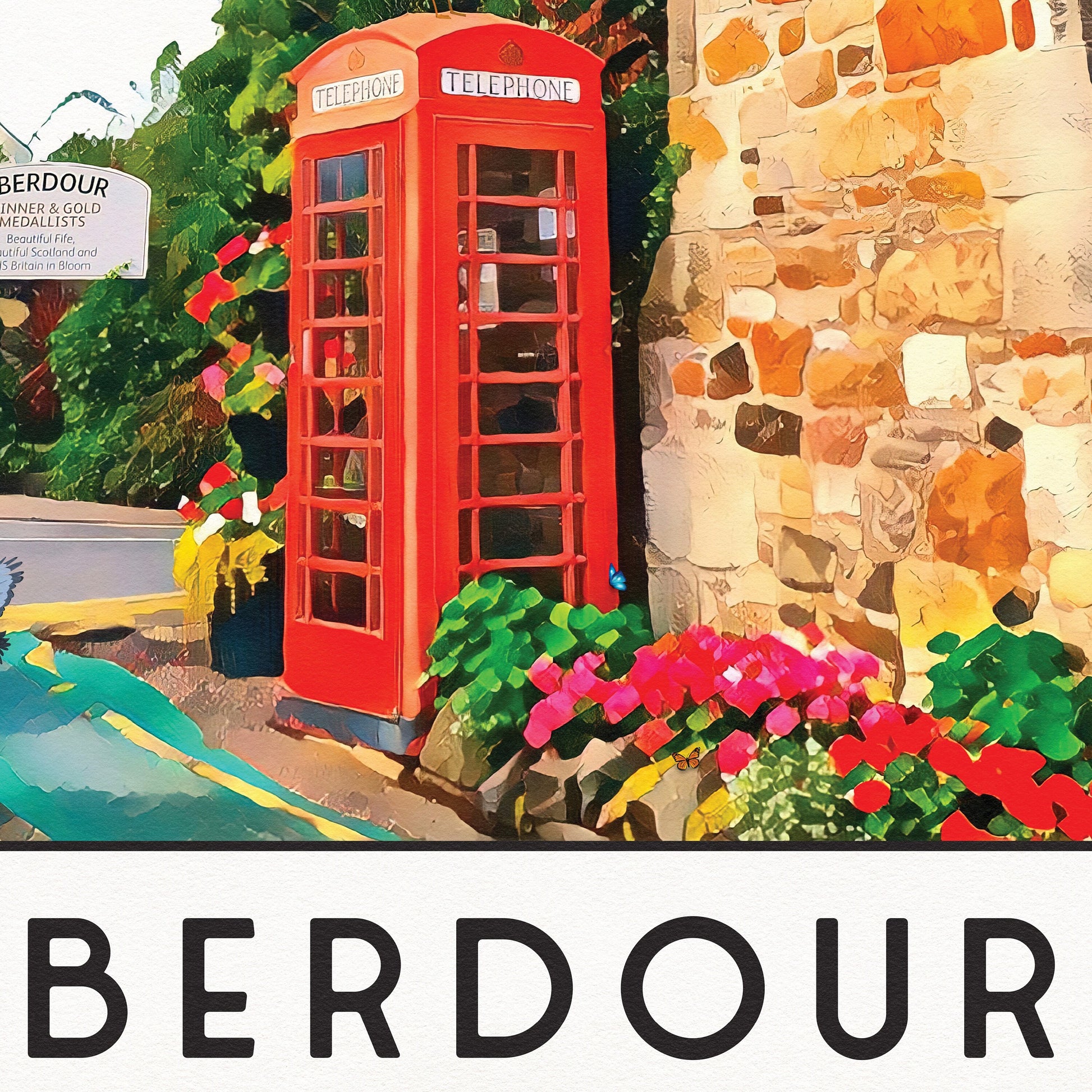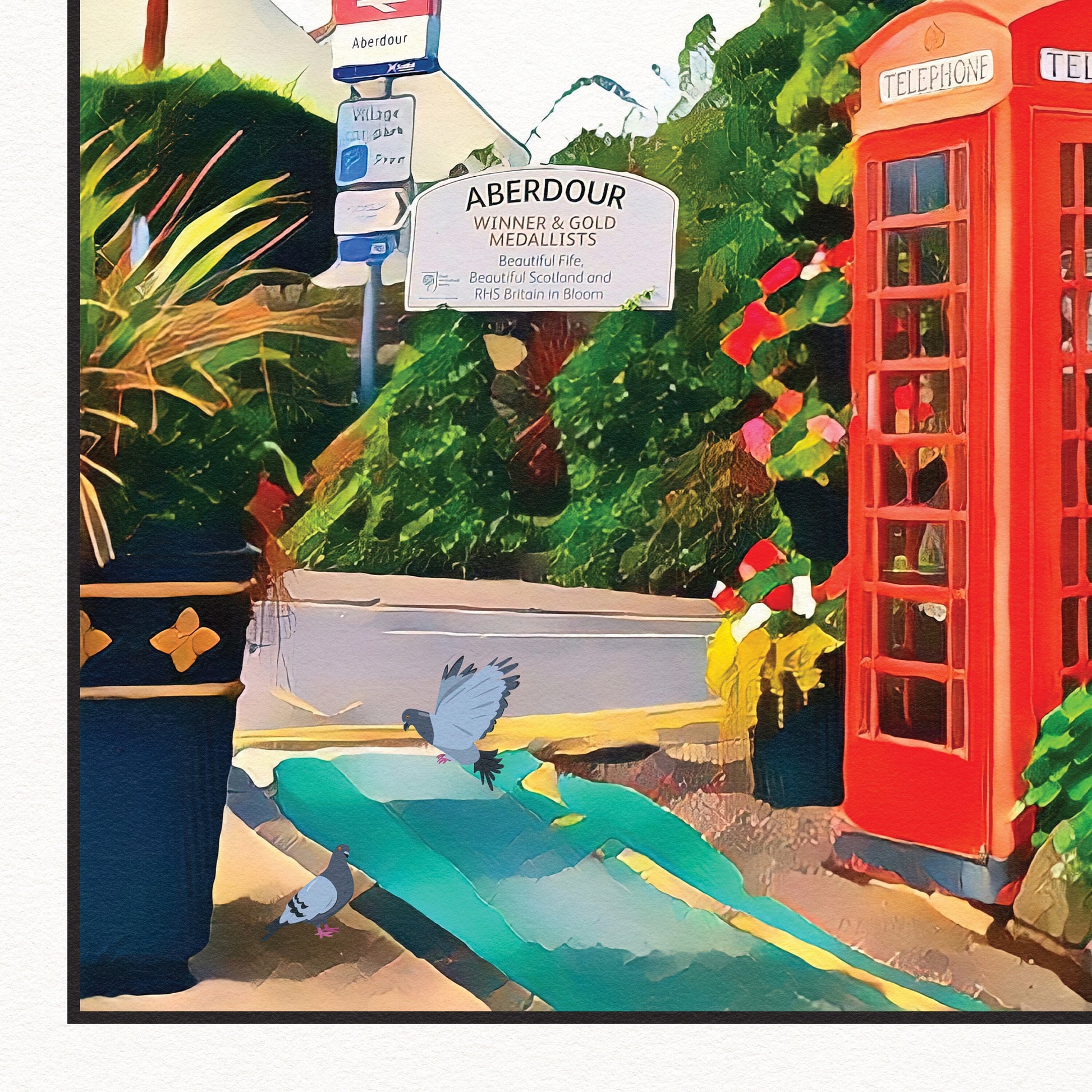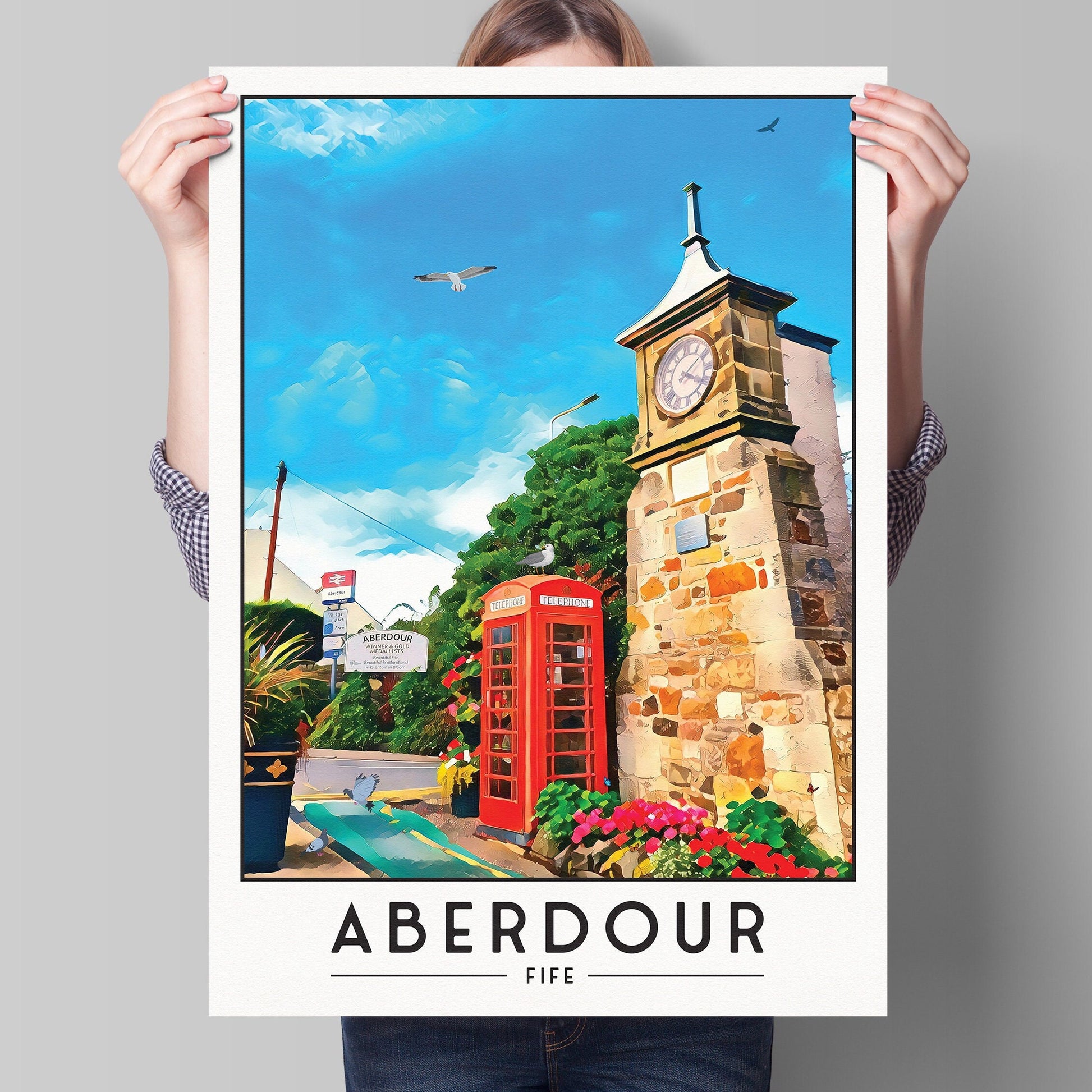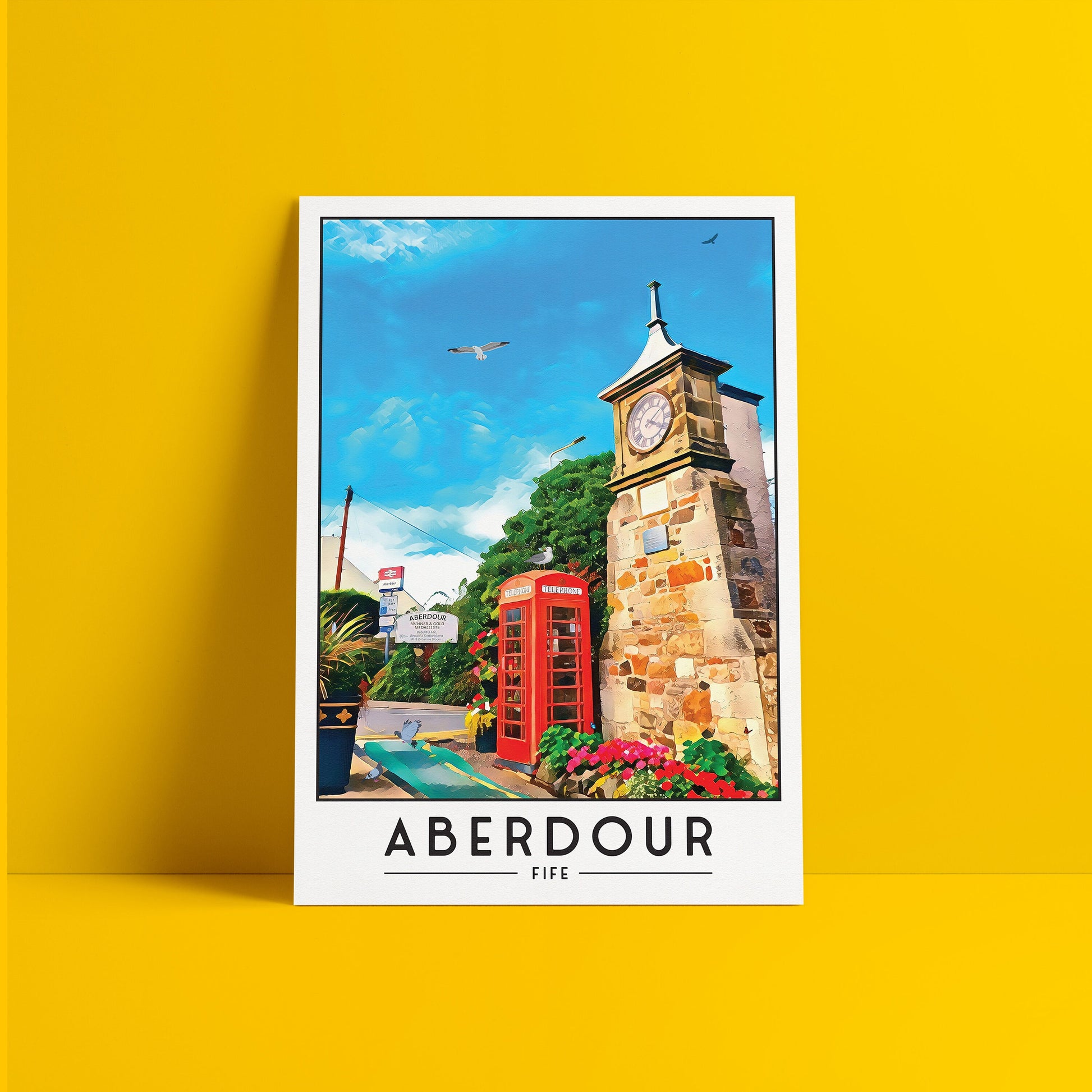 Aberdour PrintCelebrate the nostalgic charm of Aberdour Train Station with this captivating travel poster featuring the iconic red telephone box. This poster is a perfect addition for travel enthusiasts and lovers of vintage aesthetics, bringing the timeless allure of Aberdour into your home or office.Available as:A3: 16.5 x 11.7 inches