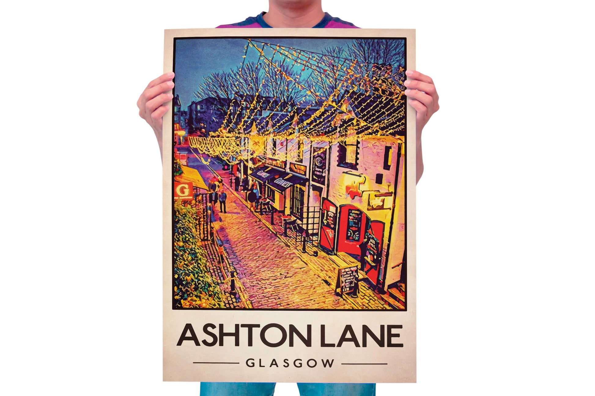 Ashton Lane Poster, Vintage looking Glasgow street illustration, Glasgow Print, Scottish Art, Scottish Gifts, Vintage Scotland
