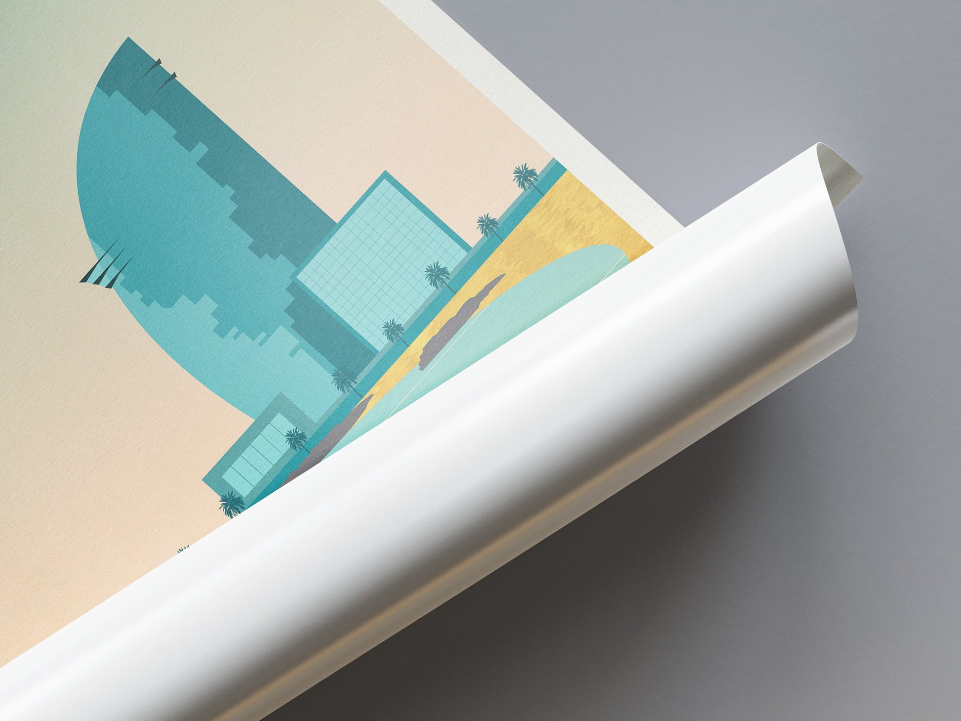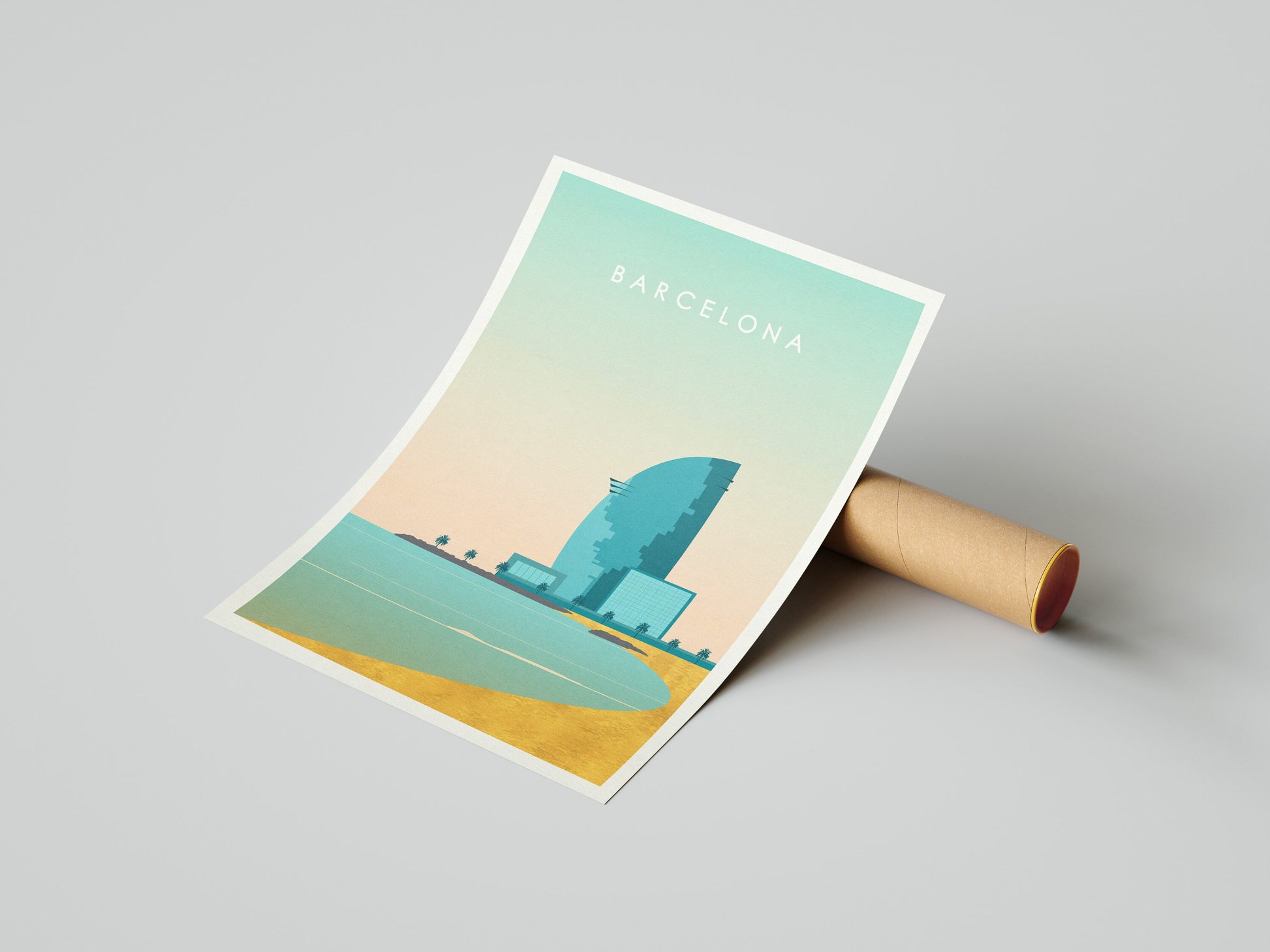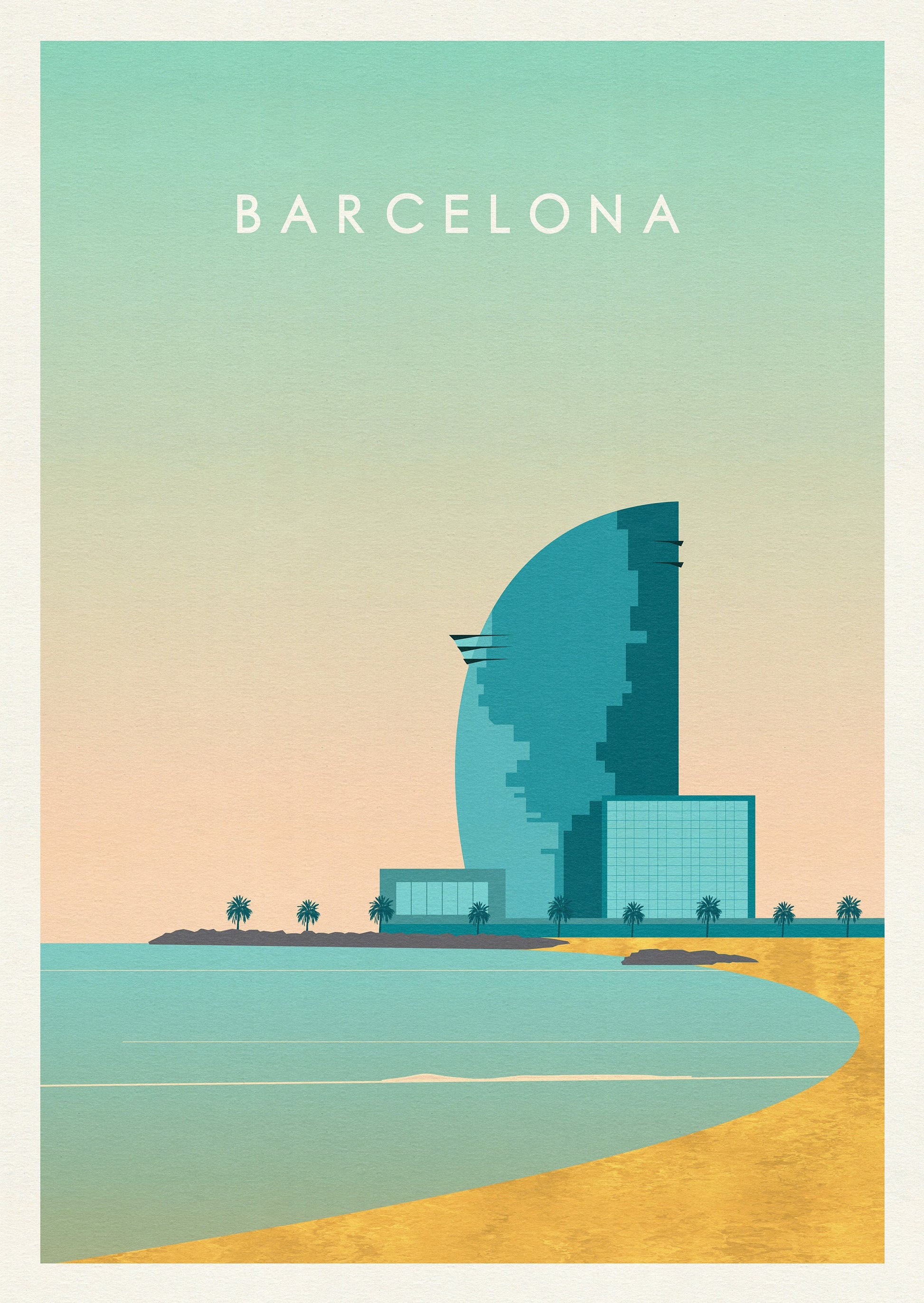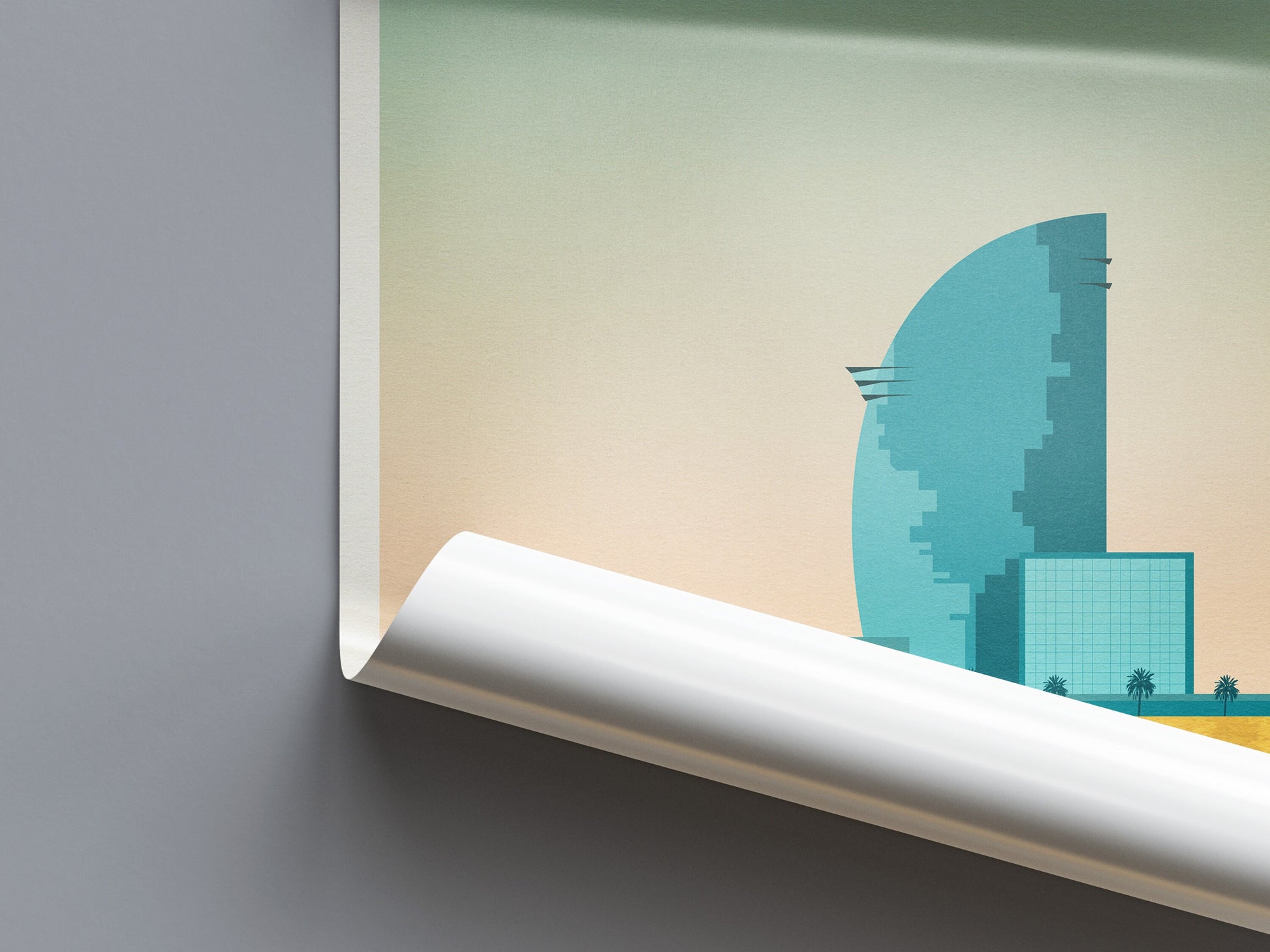 Barcelona Travel PosterA retro Barcelona poster in a flat design featuring it's glorious beach and the famous W hotel looking like a giant sail against the blue sky. Available as:A3: 16.5 x 11.7 inches