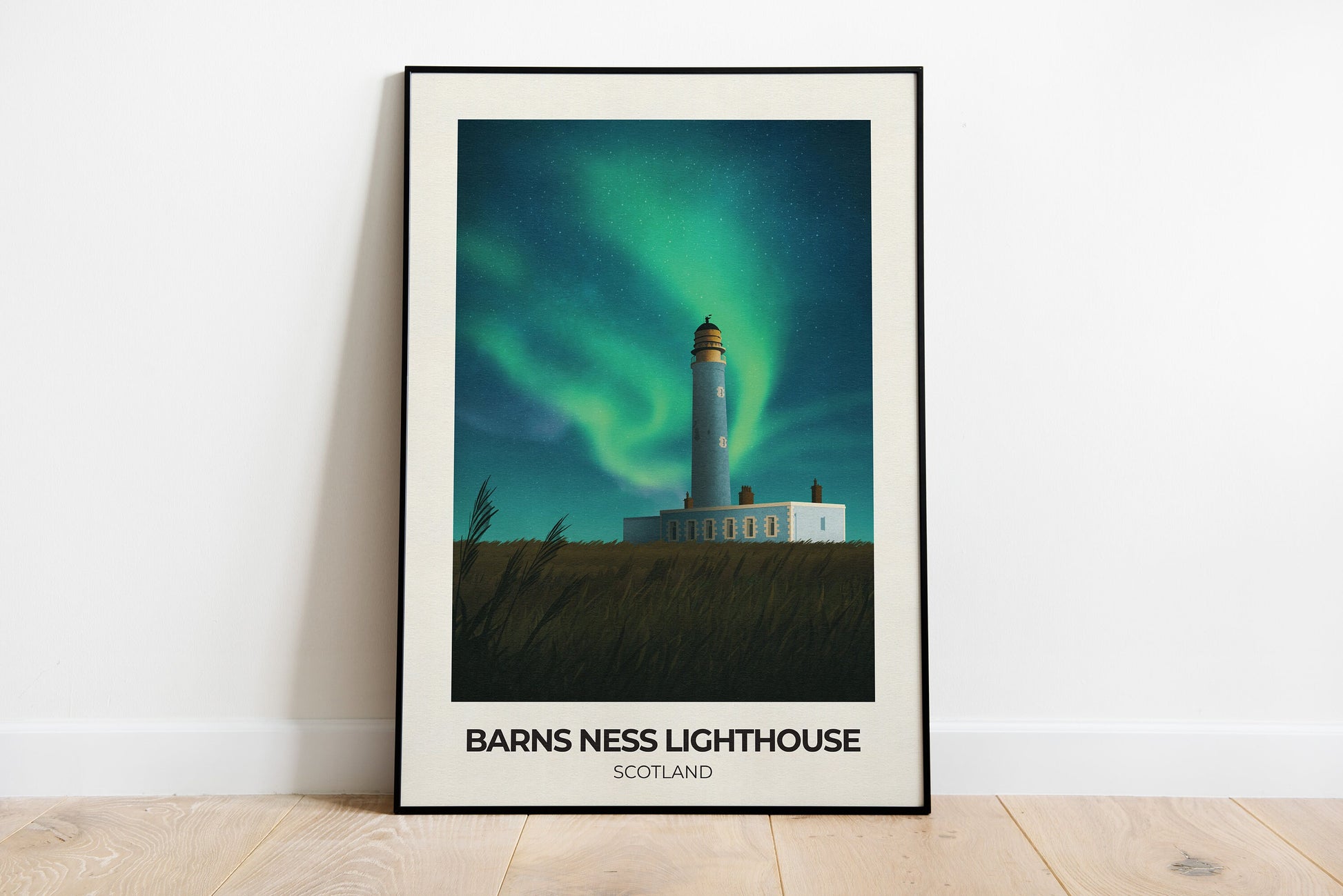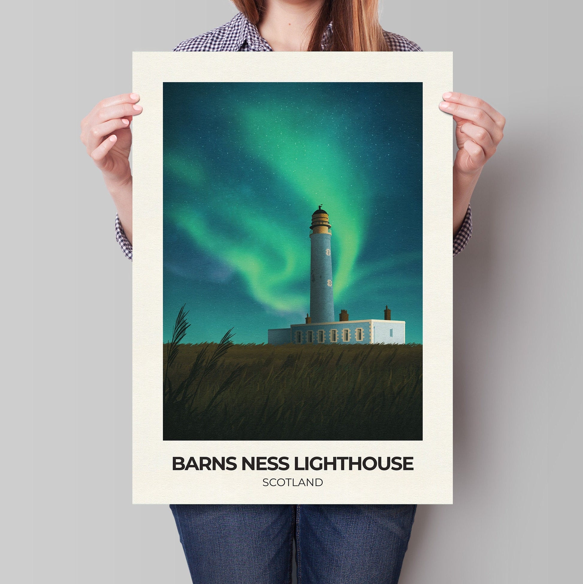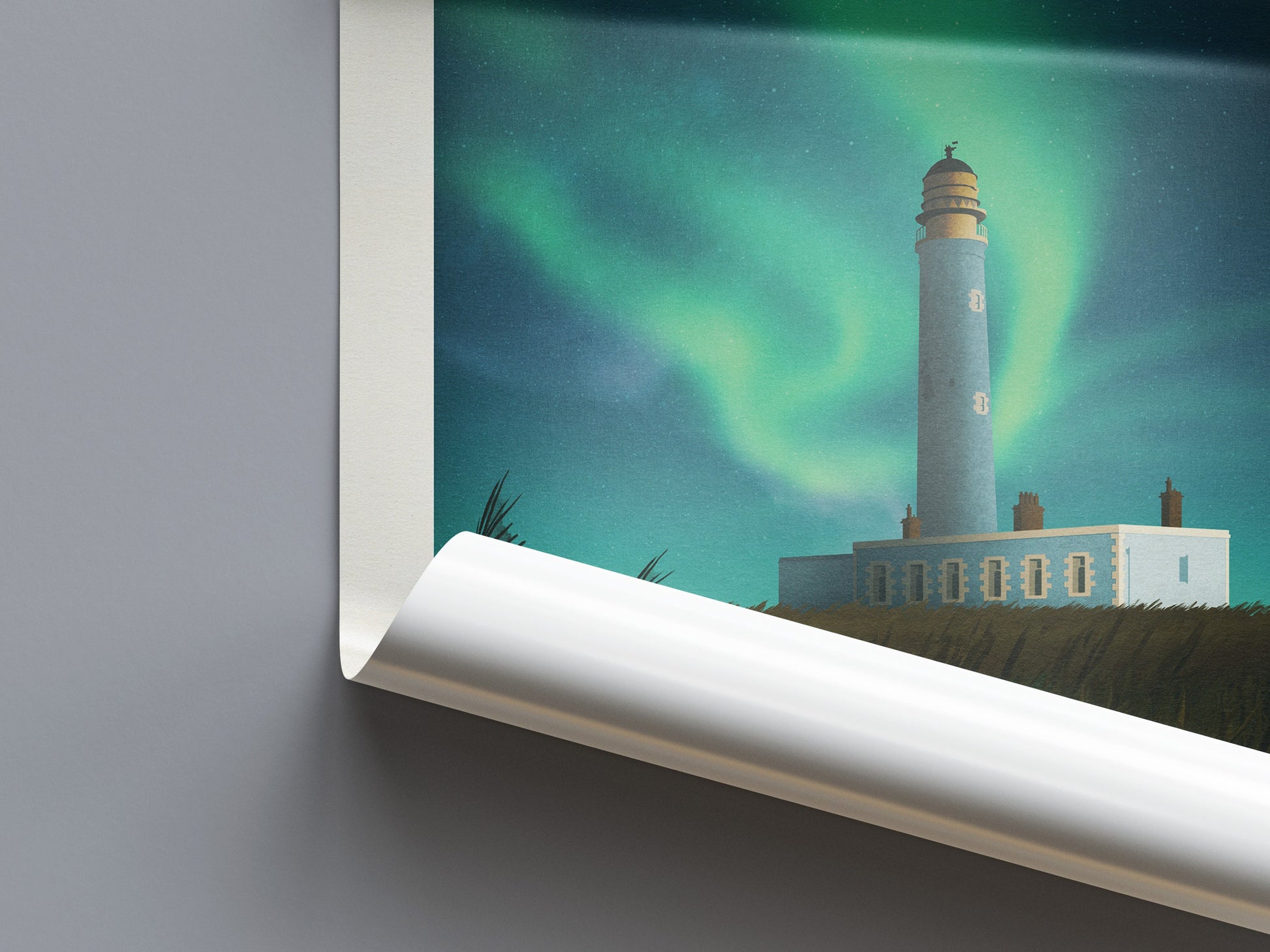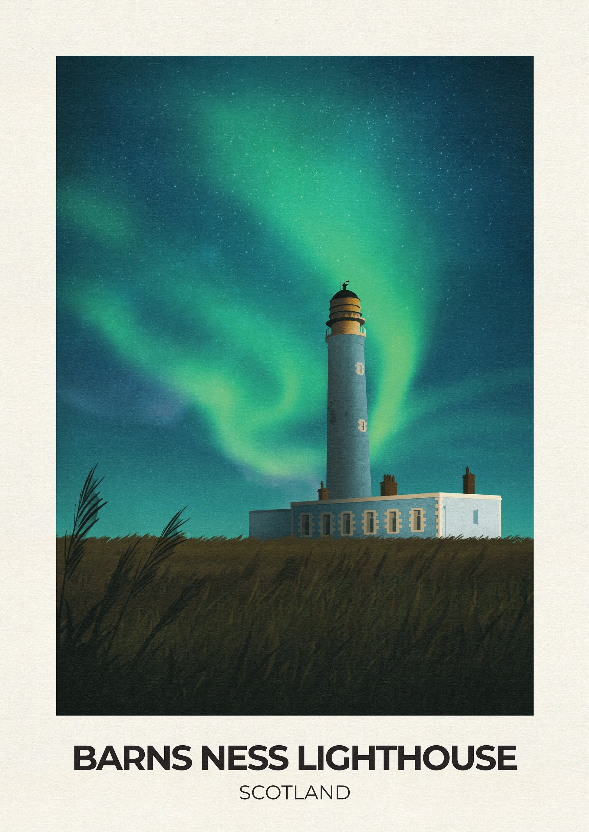 Barns Ness Lighthouse featuring the Northern Lights - Travel Poster Wall Art