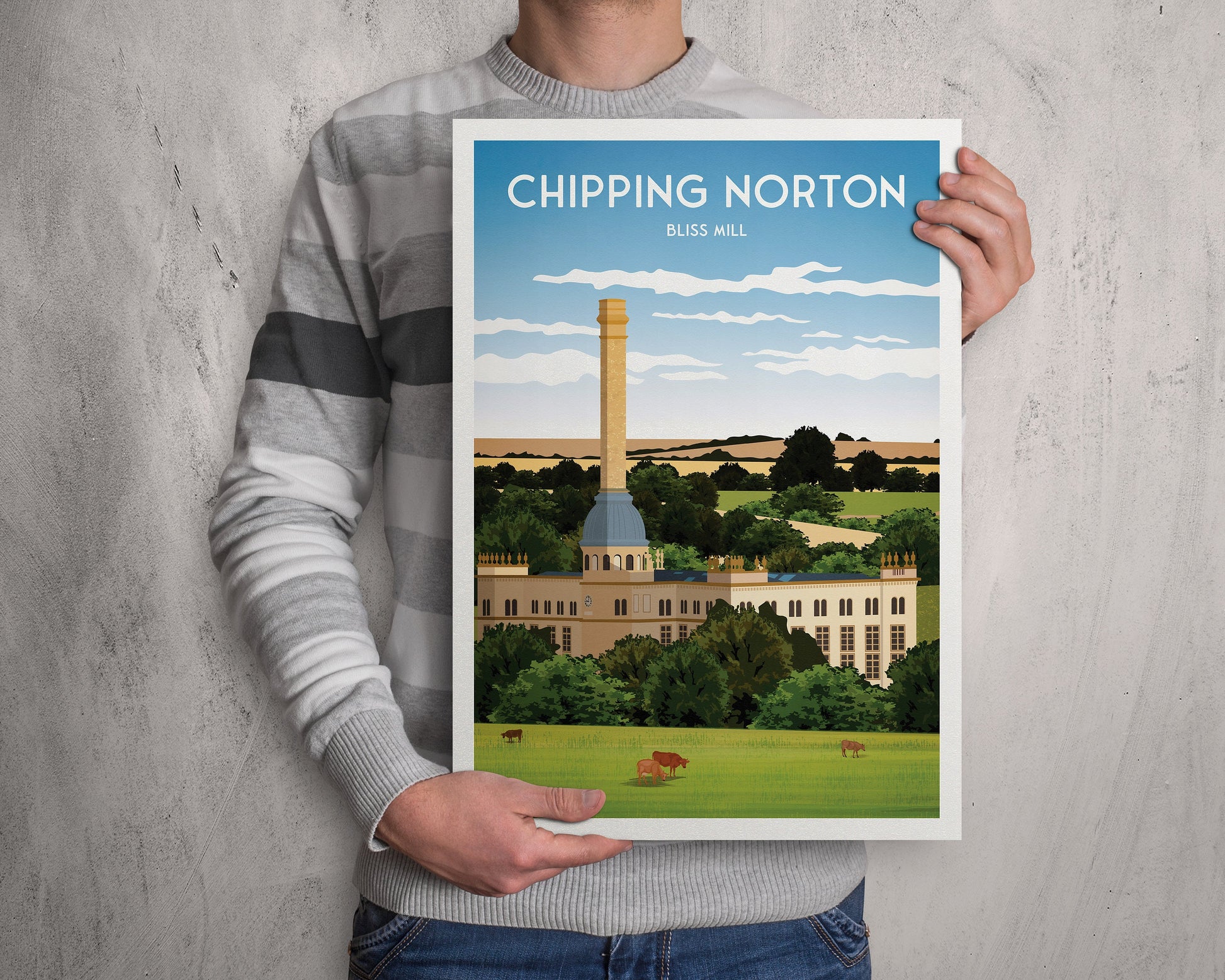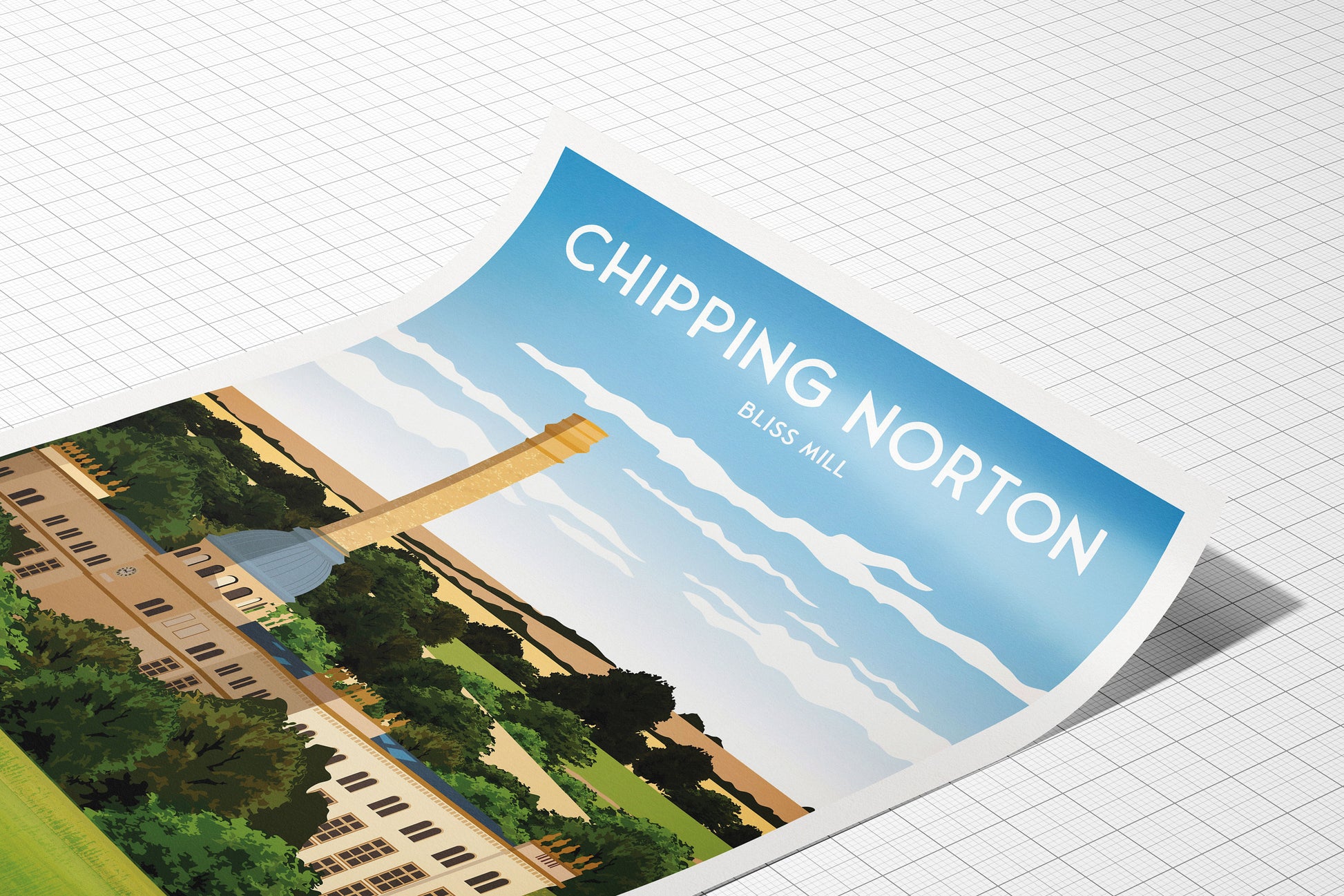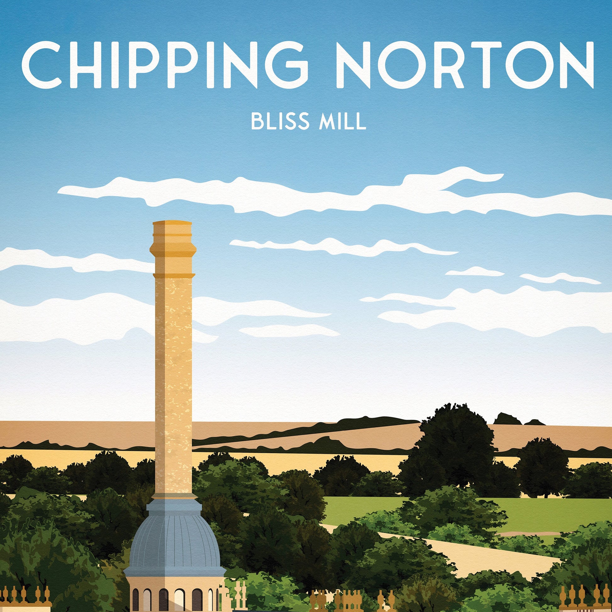 Chipping Norton printIllustration of Bliss mill, an architecturally outstanding tweed spinning mill built in 1872 from Cotswold stone and lined with attractive Victorian brick. Built by George Woodhouse, a Lancashire architect specialising in mills, It was meant to resemble a great country house in a parkland setting.Available as:A3: 16.5 x 11.7 inches