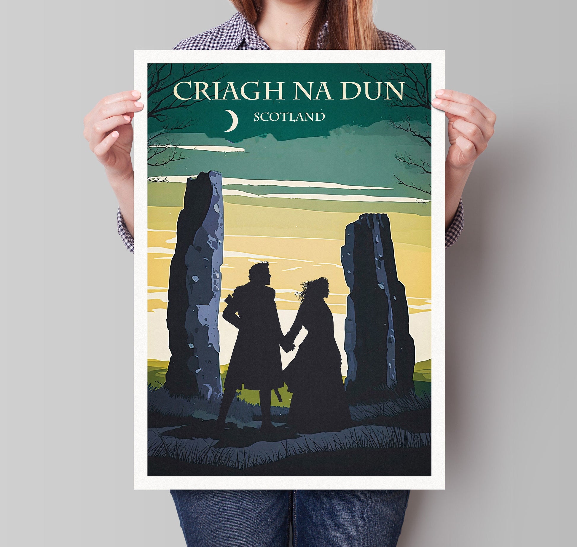 Bring the mystical beauty of Craigh na Dun standing stones to your home with this Outlander-inspired travel poster. Featuring Jamie and Claire Fraser, the poster captures the magic of the Scottish Highlands and the iconic location of Craigh na Dun. The location where they filmed Craigh na Dun scenes is on a private farm in Perthshire, Scotland, though there aren't standing stones in this location.Available in A3 (11.7 x 16.5 inches), A2 (16.5 x 23.4 inches), and 28 x 20 inches sizes, this poster is printed on high-quality paper with a choice of matt or satin finish. The matt finish gives a classic, timeless look, while the satin finish provides a more modern, vibrant appearance.This poster is perfect for fans of Outlander, those who love Scotland and its stunning scenery, or anyone looking to add some wanderlust to their home decor.Note: Frame is not included.Shipping:The poster will be carefully packaged and shipped to you within 3-5 business days via standard shipping. Expedited shipping is also available at an additional cost.Customization: