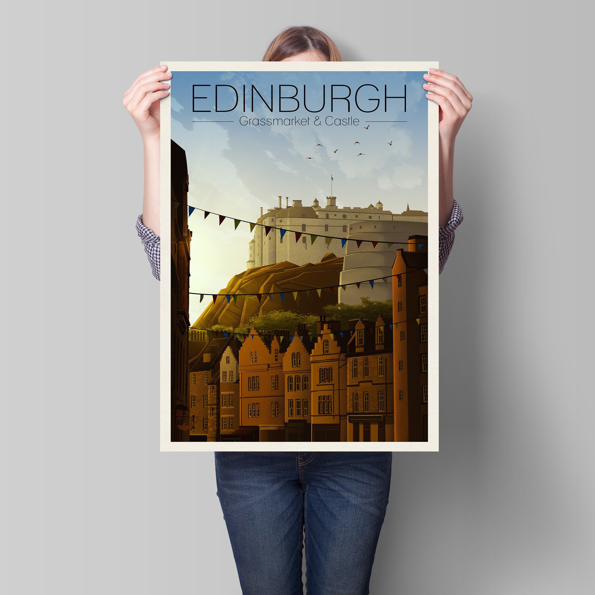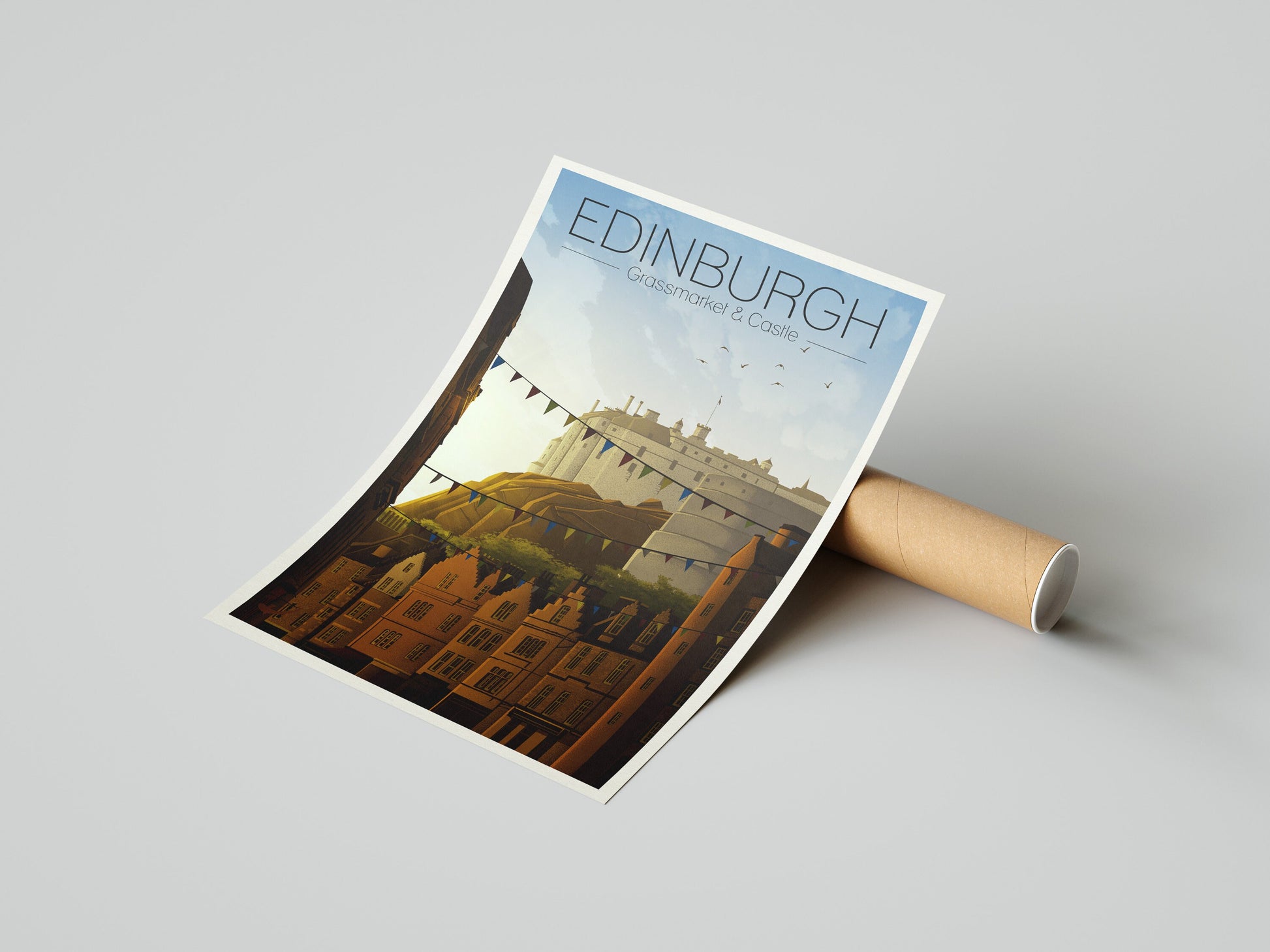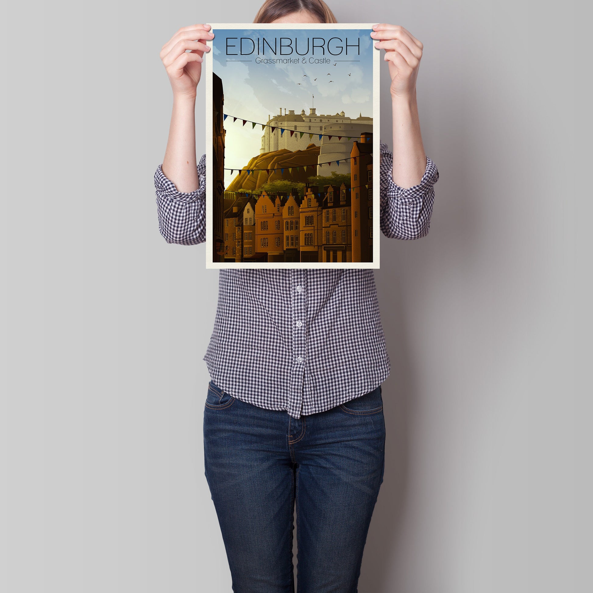 Edinburgh Grassmarket & Castle PosterVintage looking illustration of Edinburgh Castle from the Grassmarket. Edinburgh Castle is a historic fortress which dominates the skyline of Edinburgh, the capital city of Scotland, from its position on the Castle Rock. The Grassmarket is located directly below Edinburgh Castle and forms part of one of the main east-west vehicle arteries through the city centre. The Grassmarket was, from 1477, one of Edinburgh's main market places, a part of which was given over to the sale of horse and cattle. This would make for a perfect gift for someone from Edinburgh or who enjoyed a trip there. Available as :