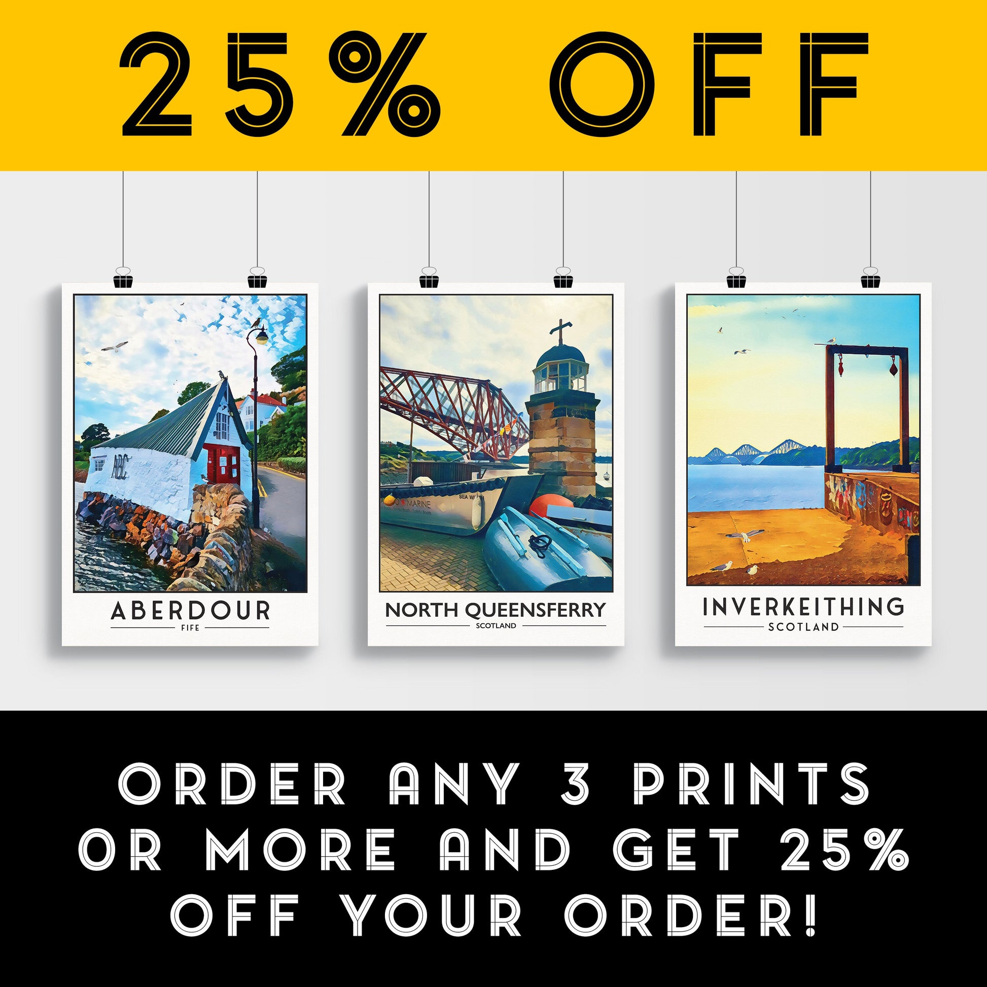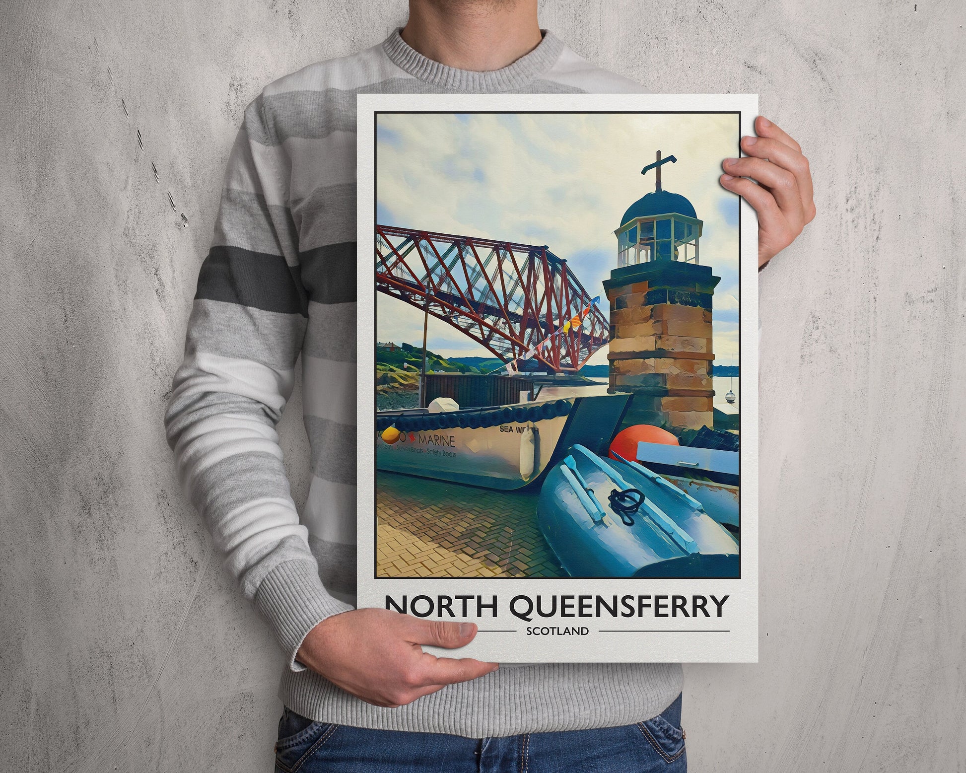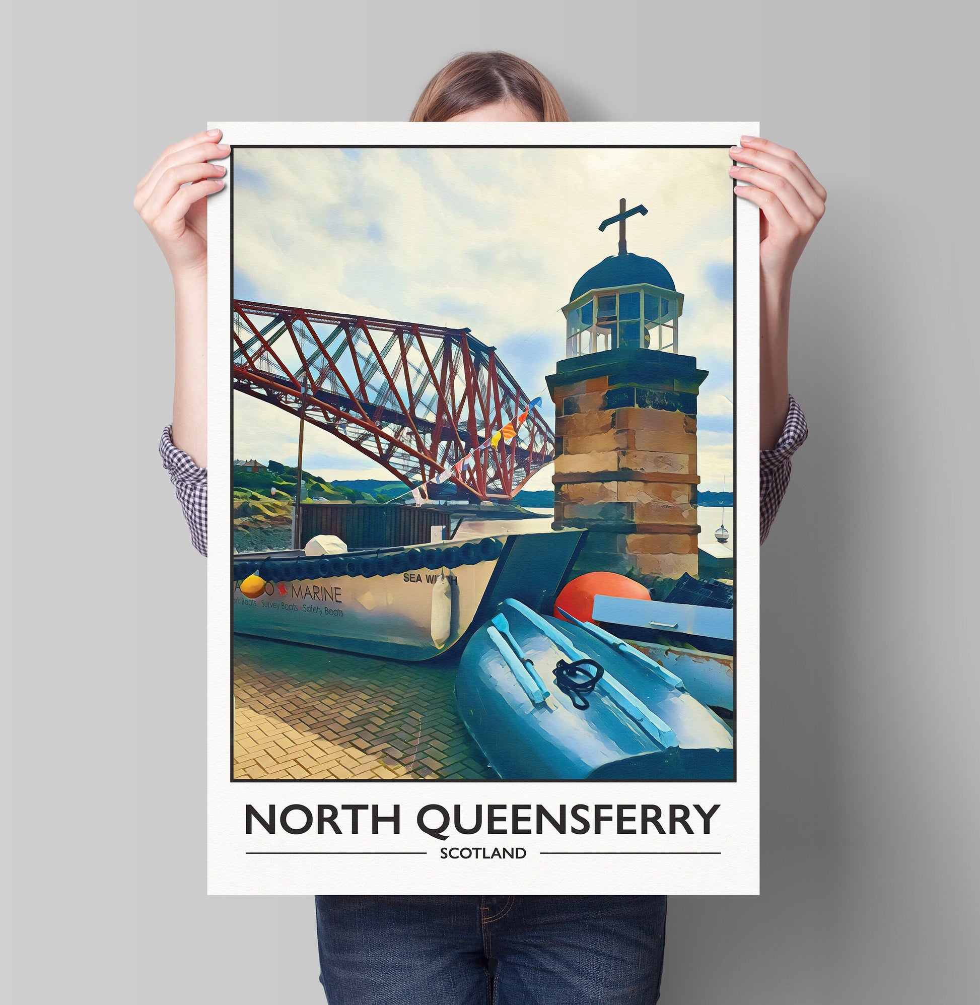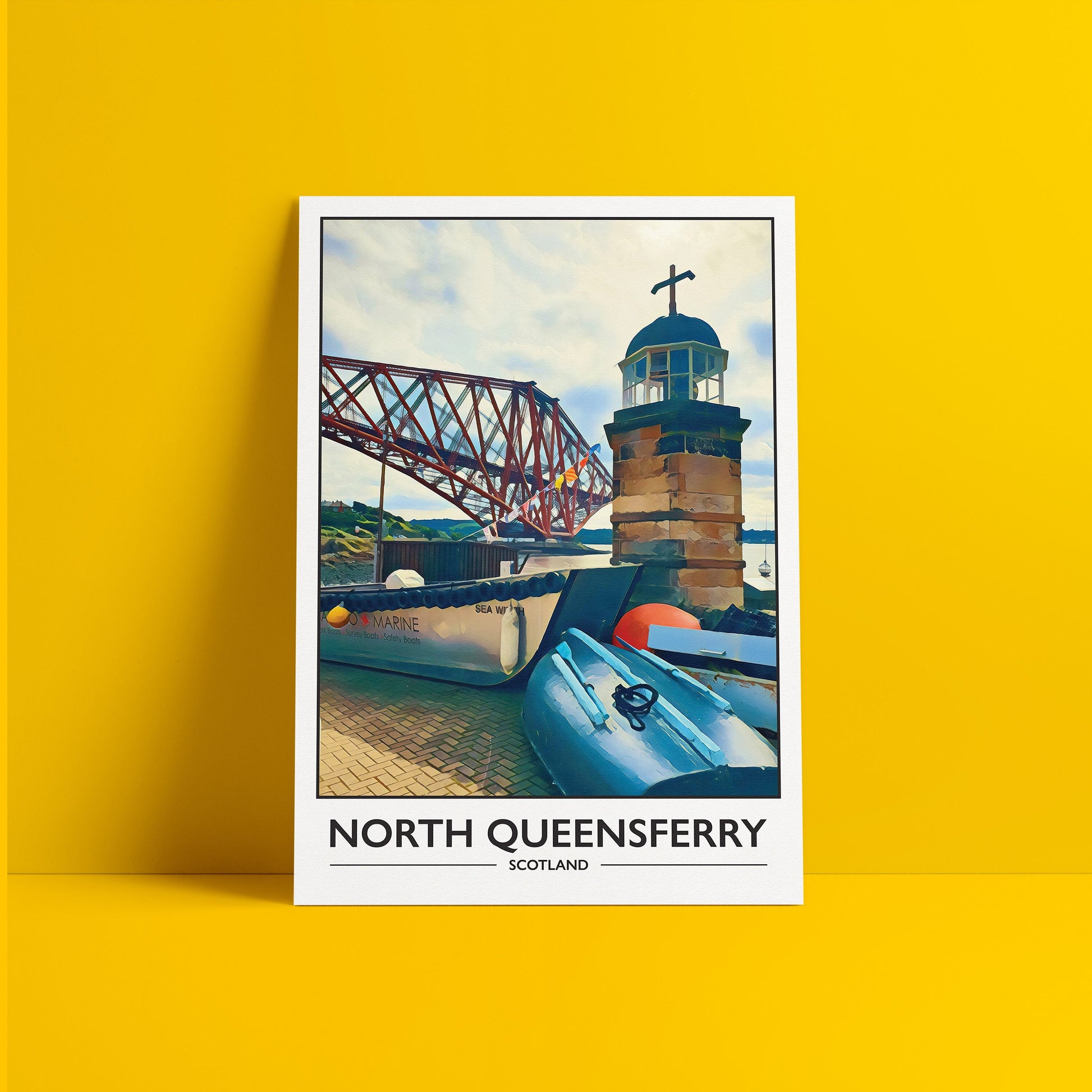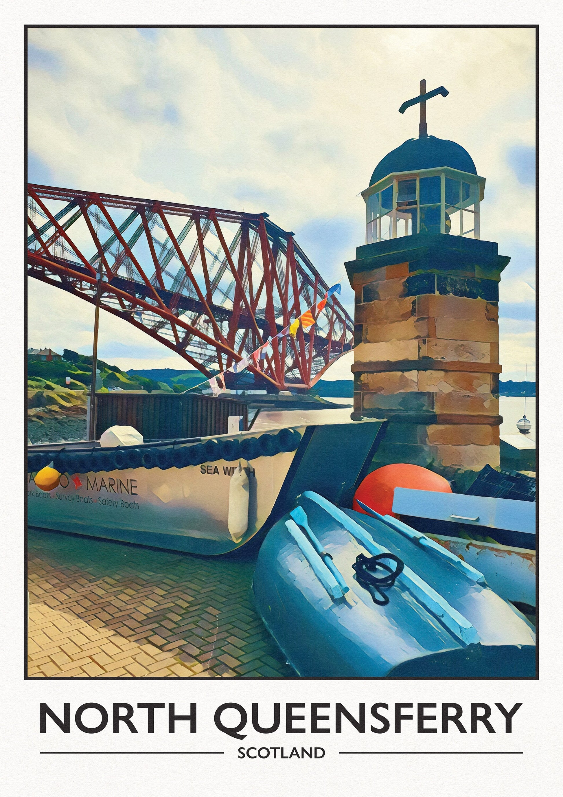 North Queensferry Print Colourful illustration of the North Queensferry featuring the Forth Bridge and the Light tower. The Light tower is the world’s smallest working Light Tower with a unique view to the Forth Bridge, a UNESCO World Heritage Site. It was uilt in 1817 by Robert Stevenson as a key part of the “Queensferry Passage”across the Forth, this tiny part of Scottish maritime history has now been carefully restored to full working order. It reopened to the public in June 2010, when HRH The Princess Royal relit the lamp 120 years after it fell into disuse. Construction of the Forth bridge began in 1882 and it was opened on 4 March 1890 by the Duke of Rothesay, the future Edward VII. The bridge carries the Edinburgh–Aberdeen line across the Forth between the villages of South Queensferry and North Queensferry and has a total length of 8,094 feetAvailable as:A3: 16.5 x 11.7 inches