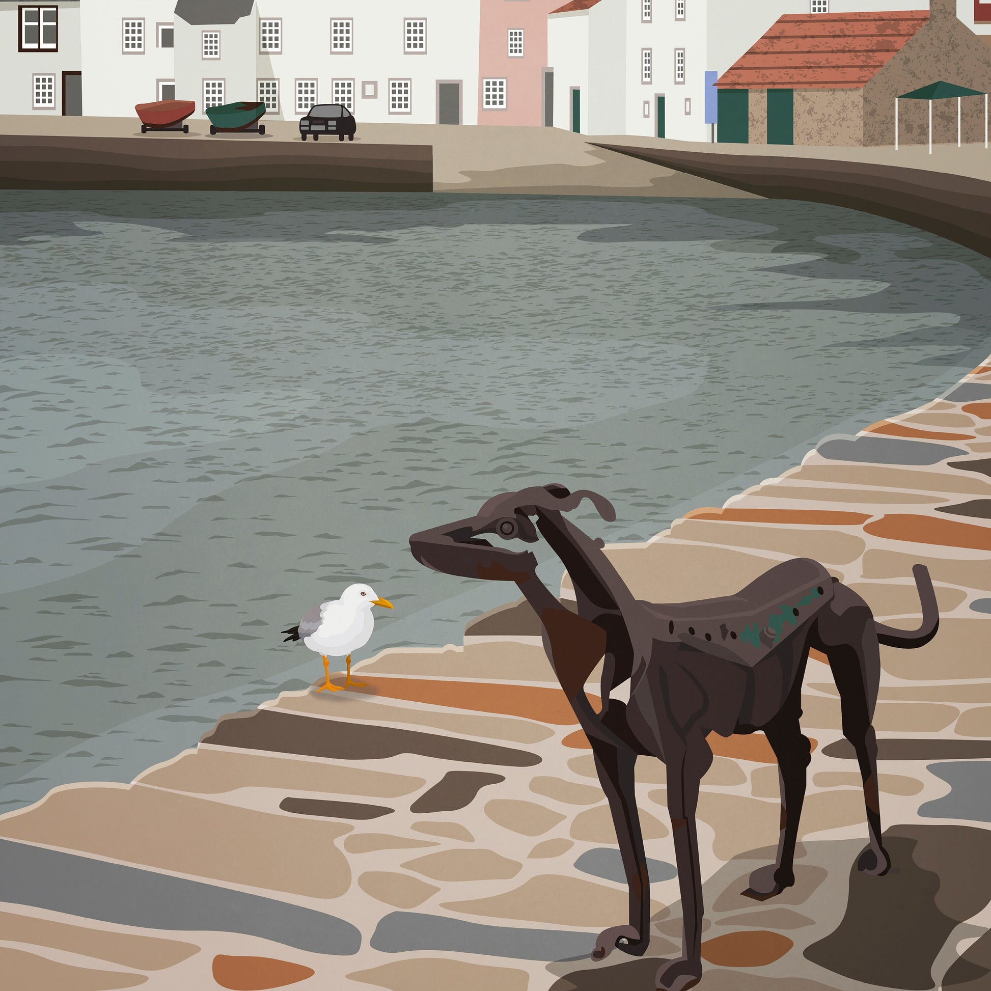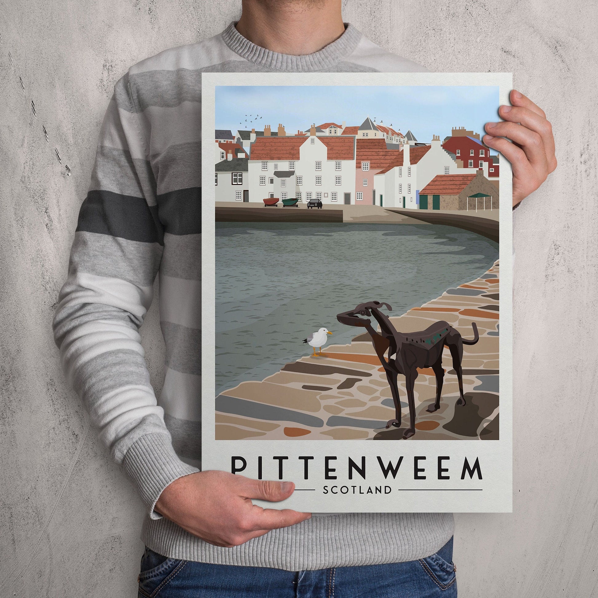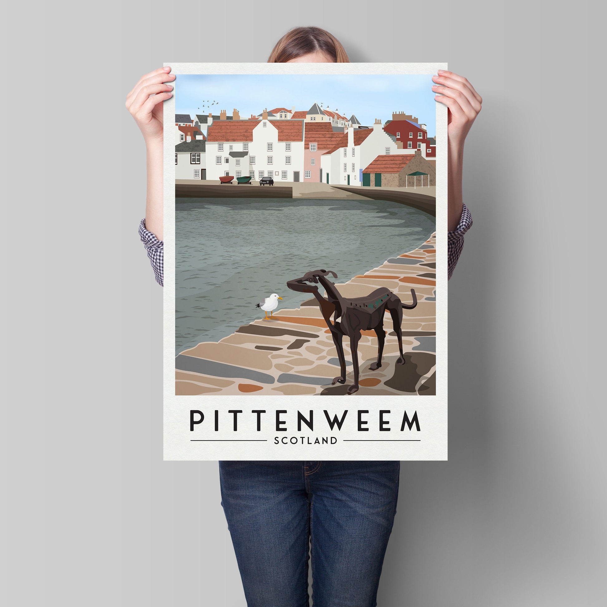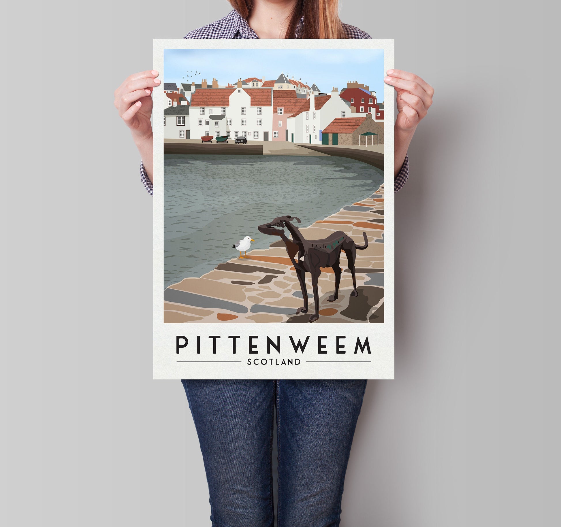 Pittenweem PosterPittenweem is a pleasant fishing village in the East Neuk of Fife.This print illustrates the harbour, the main focus of the village, still an active place for fishing boats to return with their daily fish market produce. Many of the pretty houses around the harbour are of traditional Fife design, noted for their red pantile or grey-slate roofs with crow-step gables. The village is also known for it's art festival they have every year, attracting many thousands of visitors. This illustration depicts a sculpture of a dog that was on display in a previous year. I think the seagull quite likes it!