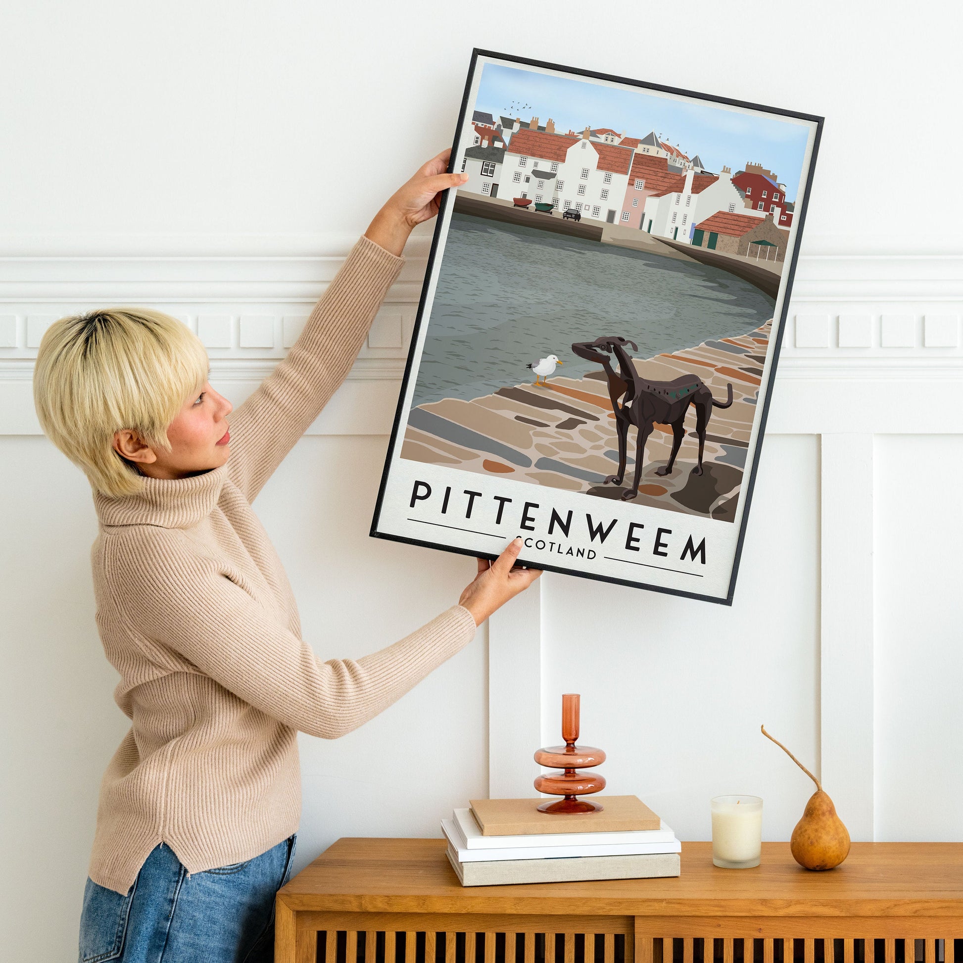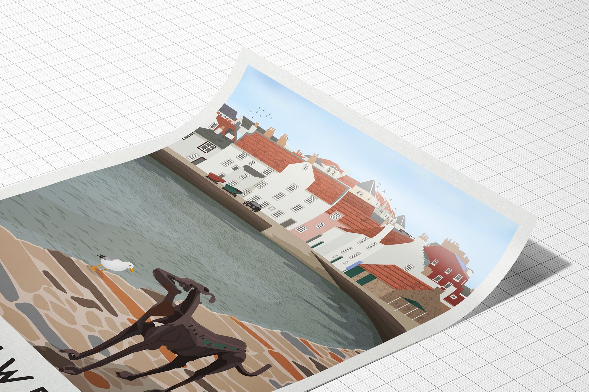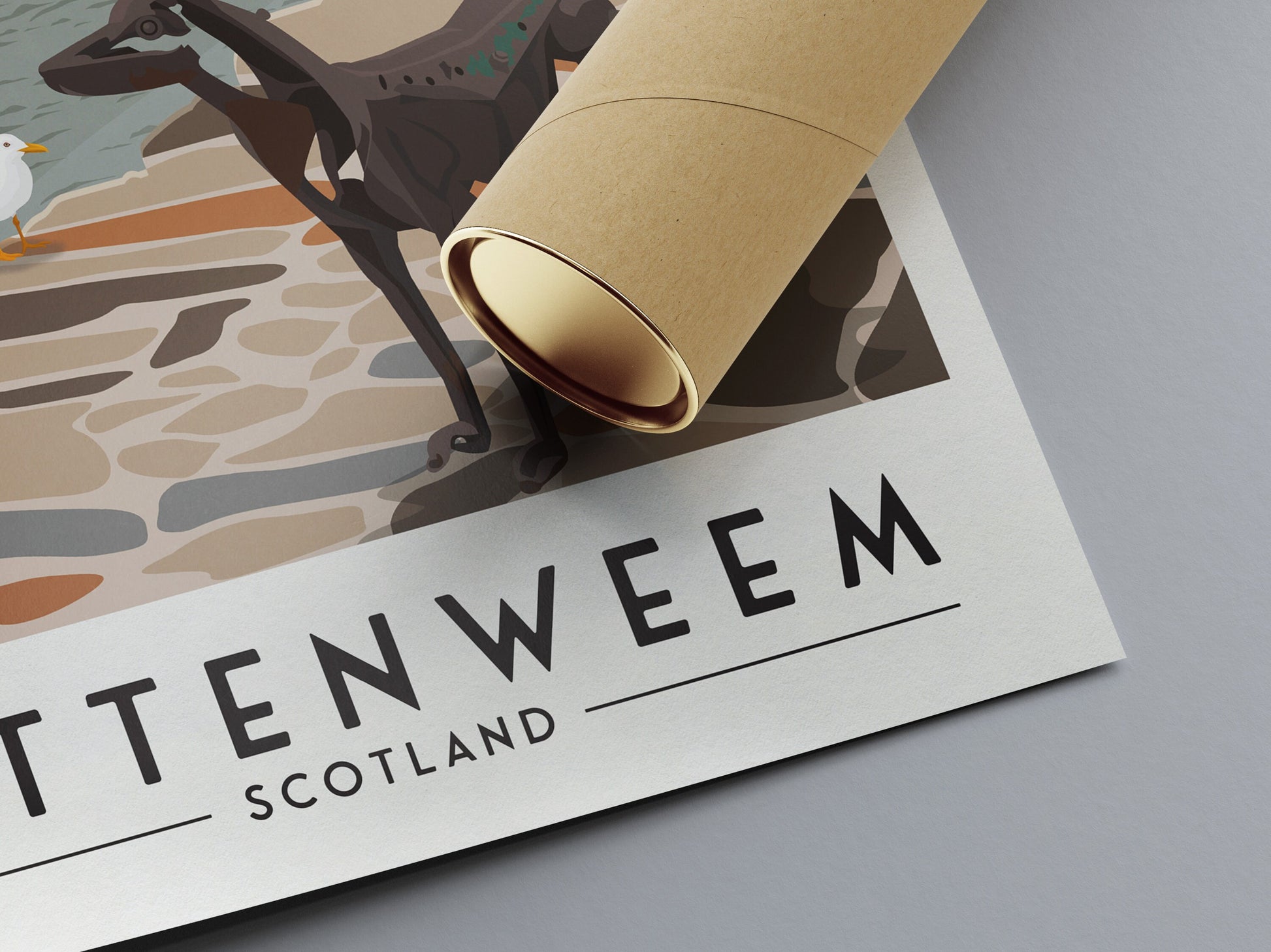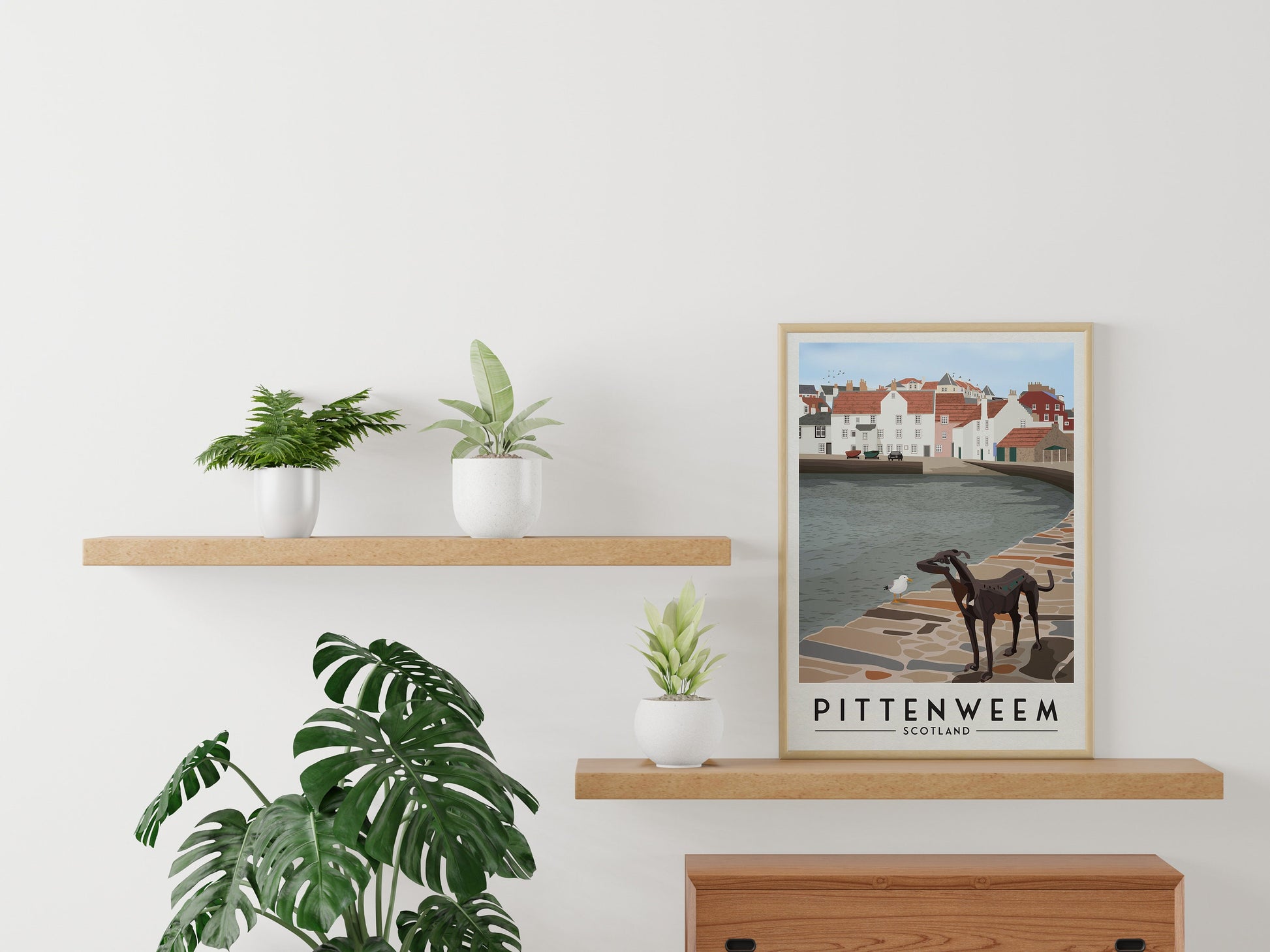 Pittenweem PosterPittenweem is a pleasant fishing village in the East Neuk of Fife.This print illustrates the harbour, the main focus of the village, still an active place for fishing boats to return with their daily fish market produce. Many of the pretty houses around the harbour are of traditional Fife design, noted for their red pantile or grey-slate roofs with crow-step gables. The village is also known for it's art festival they have every year, attracting many thousands of visitors. This illustration depicts a sculpture of a dog that was on display in a previous year. I think the seagull quite likes it!