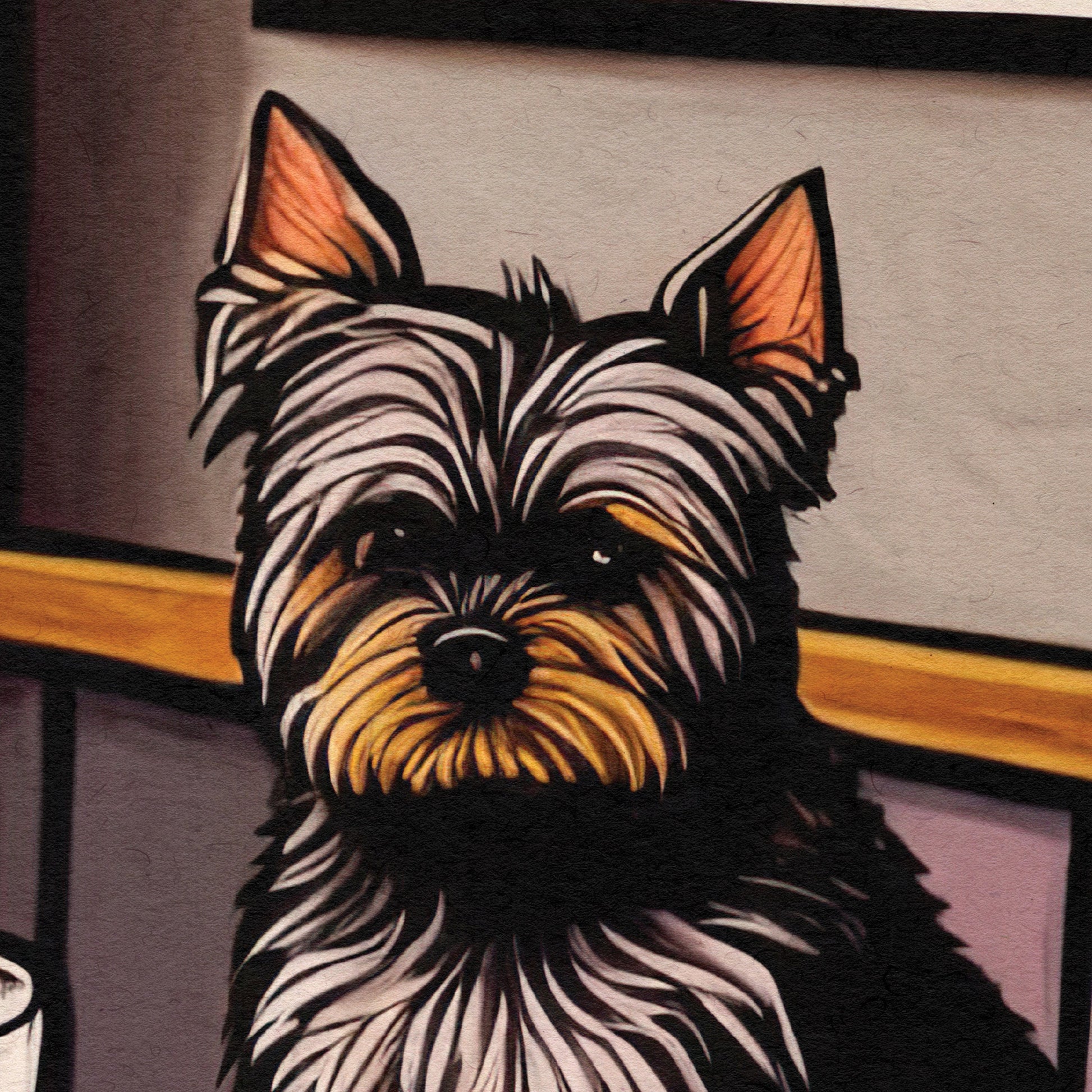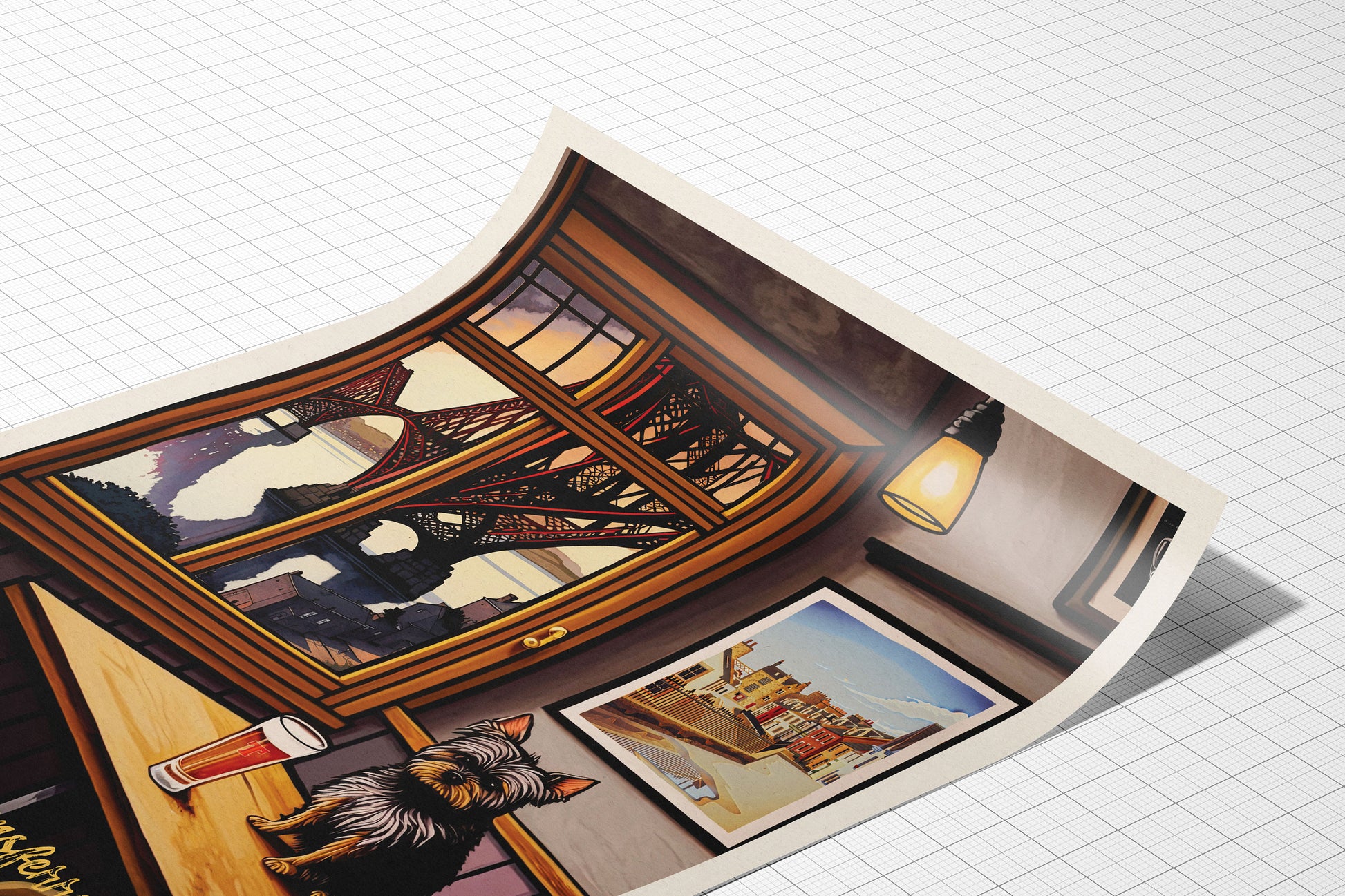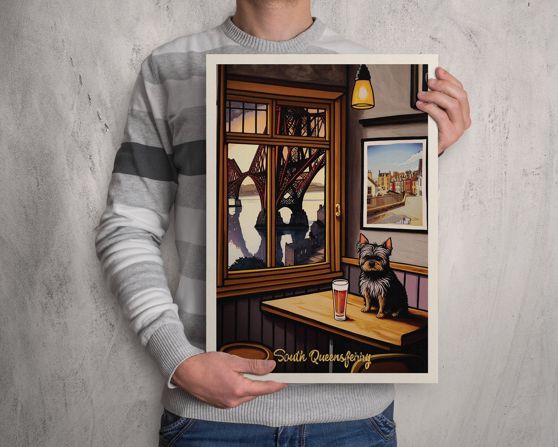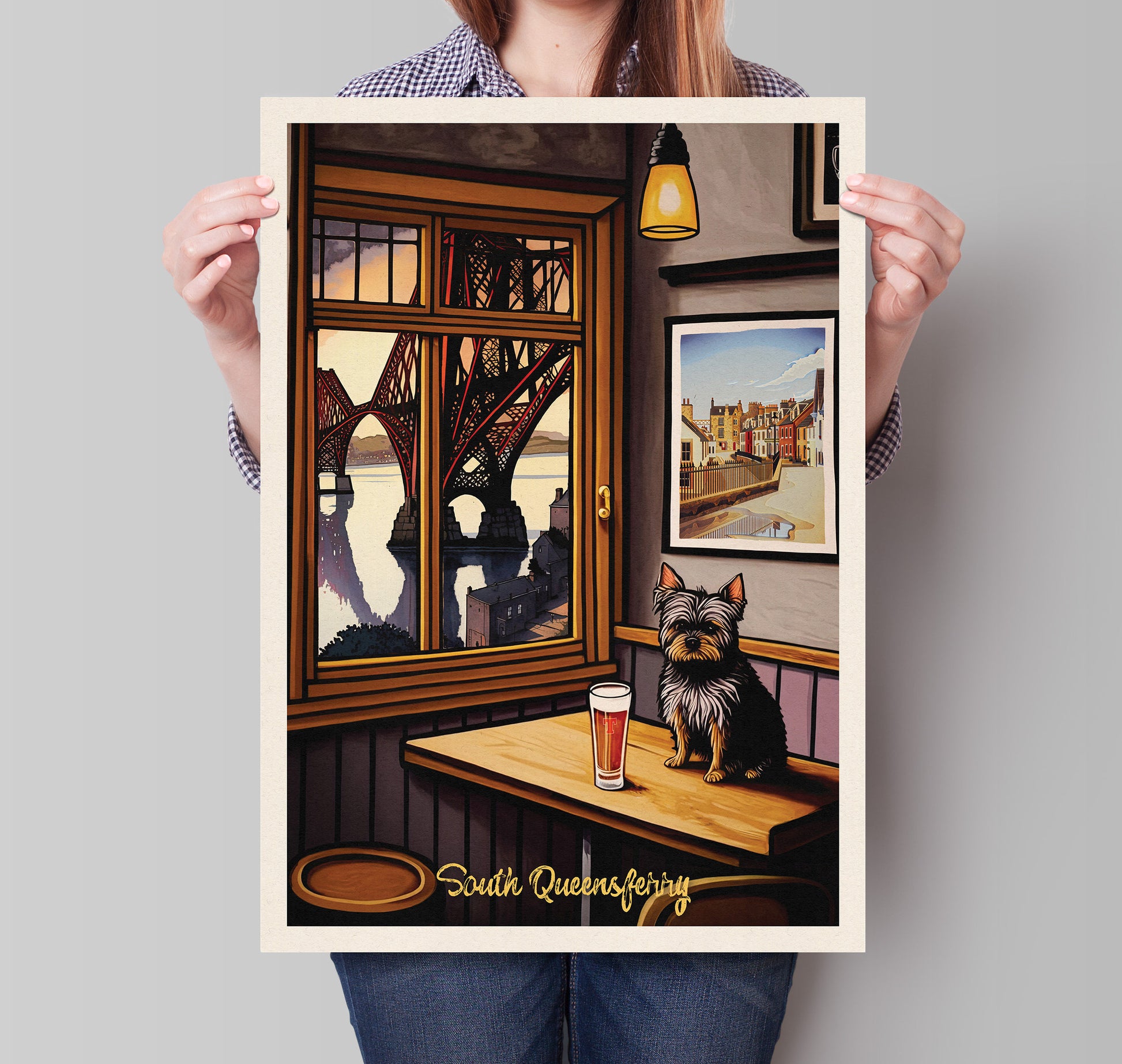 South Queensferry Pub with a View of the Forth BridgeAn whimsical illustration of a terrier dog in a pub with the forth bridge visible through the window.. This would make for a perfect gift for someone from South Queensferry or who enjoyed a trip there. Available as :A3: 16.5 x 11.7 inches