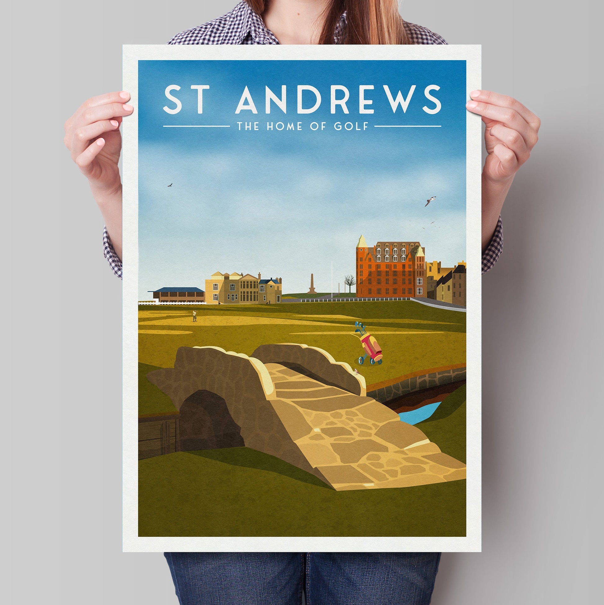 St Andrews Golf PrintThe Old Course at St Andrews, also known as the Grand Old Lady, is considered the oldest golf course. This print features the famous Swilcan Bridge , golfers and a set of golf clubs. If you look closely you can also see a birdie, Eagle and albatross!Available as :A3: 16.5 x 11.7 inches