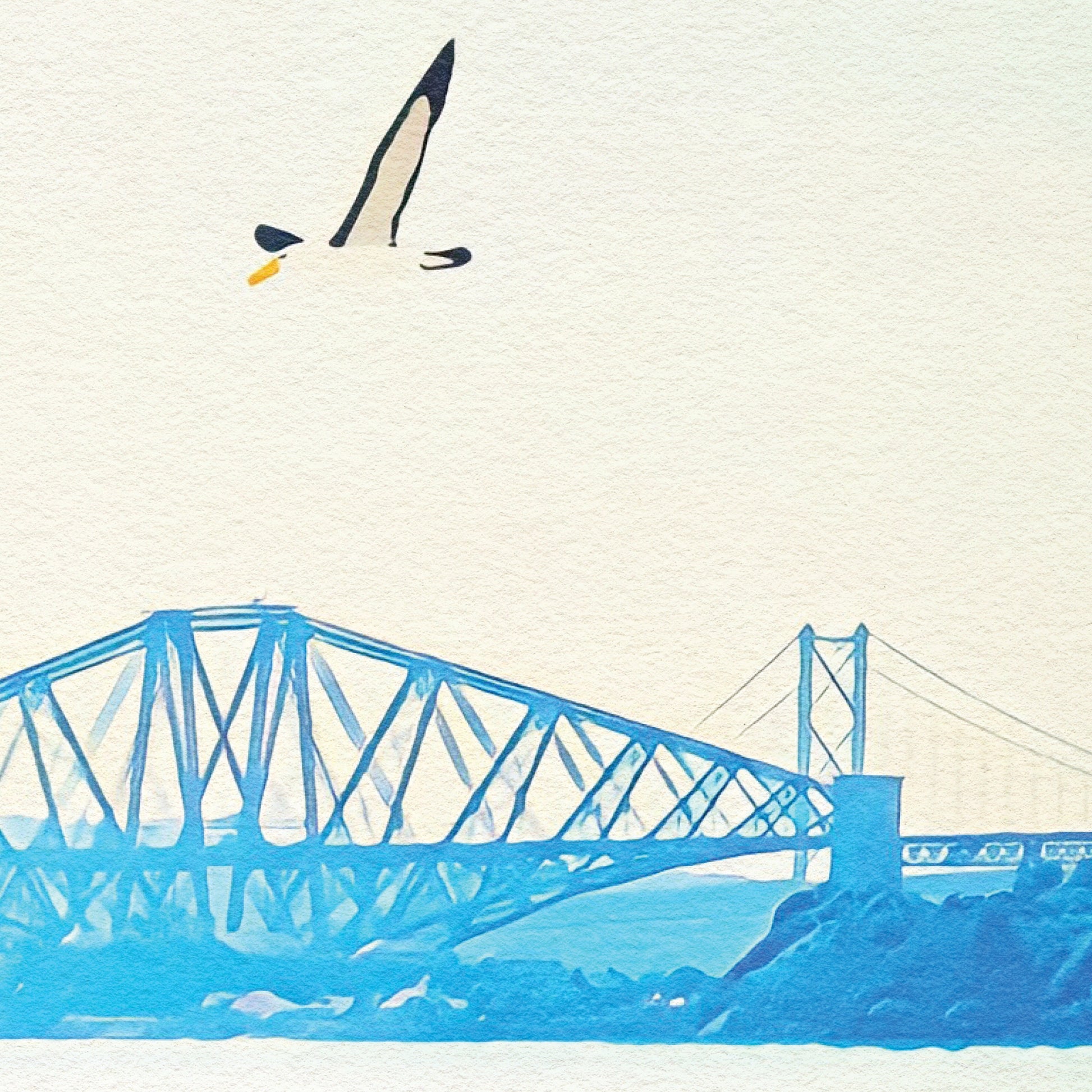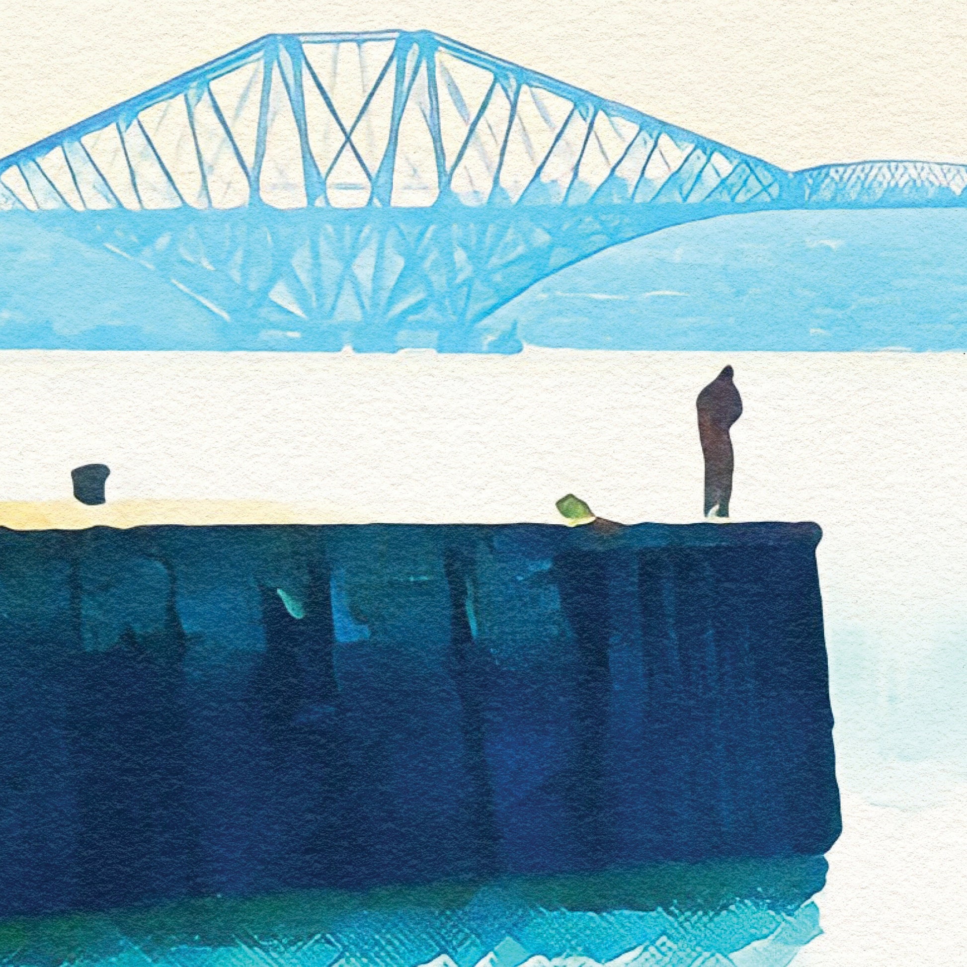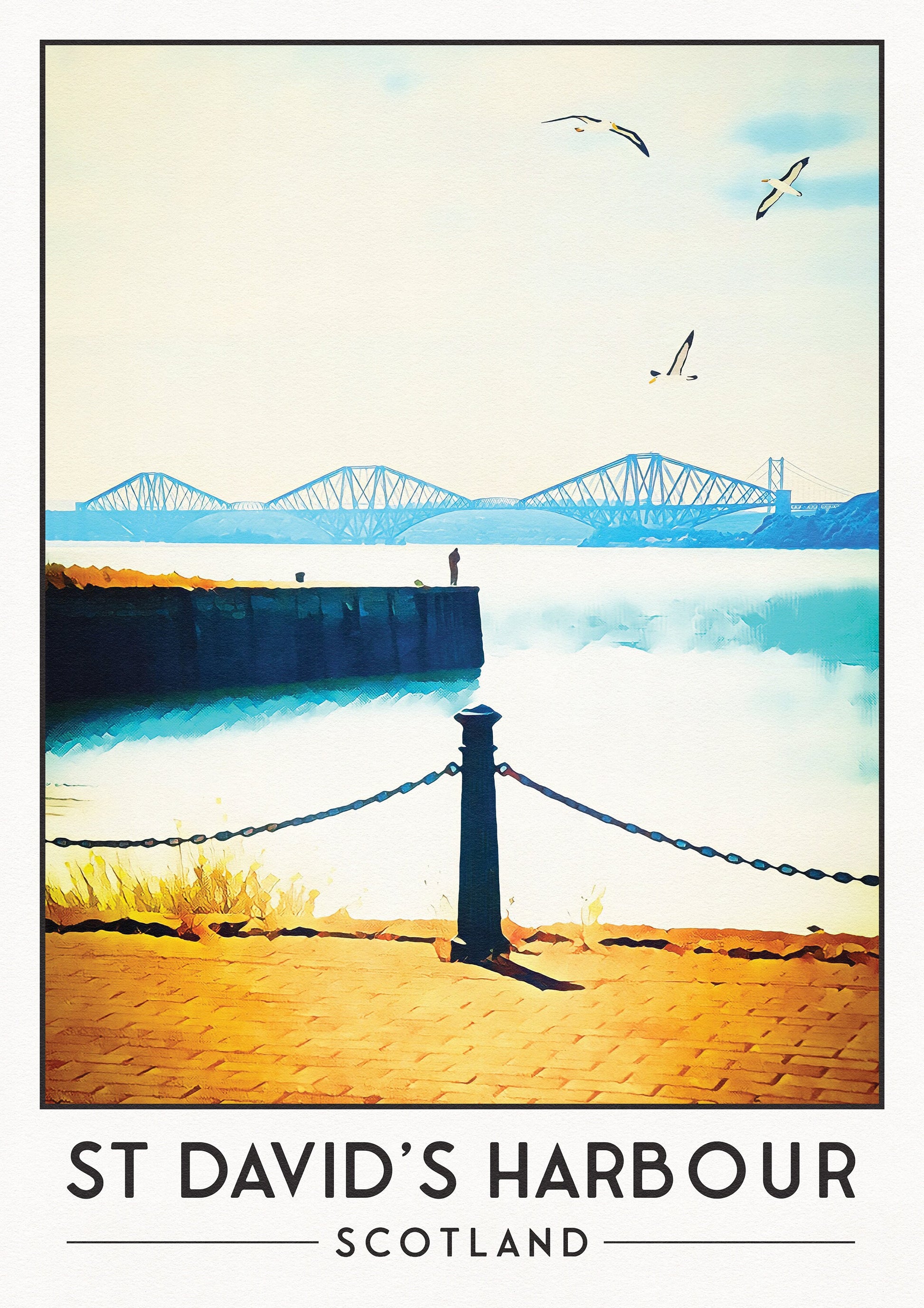 St David's Harbour PrintColourful illustration of a fisherman at St David's Harbour in Dalgety Bay, featuring the Forth Bridge and also the Forth Road Bridge. And seagulls of course :)Available as:A3: 16.5 x 11.7 inches