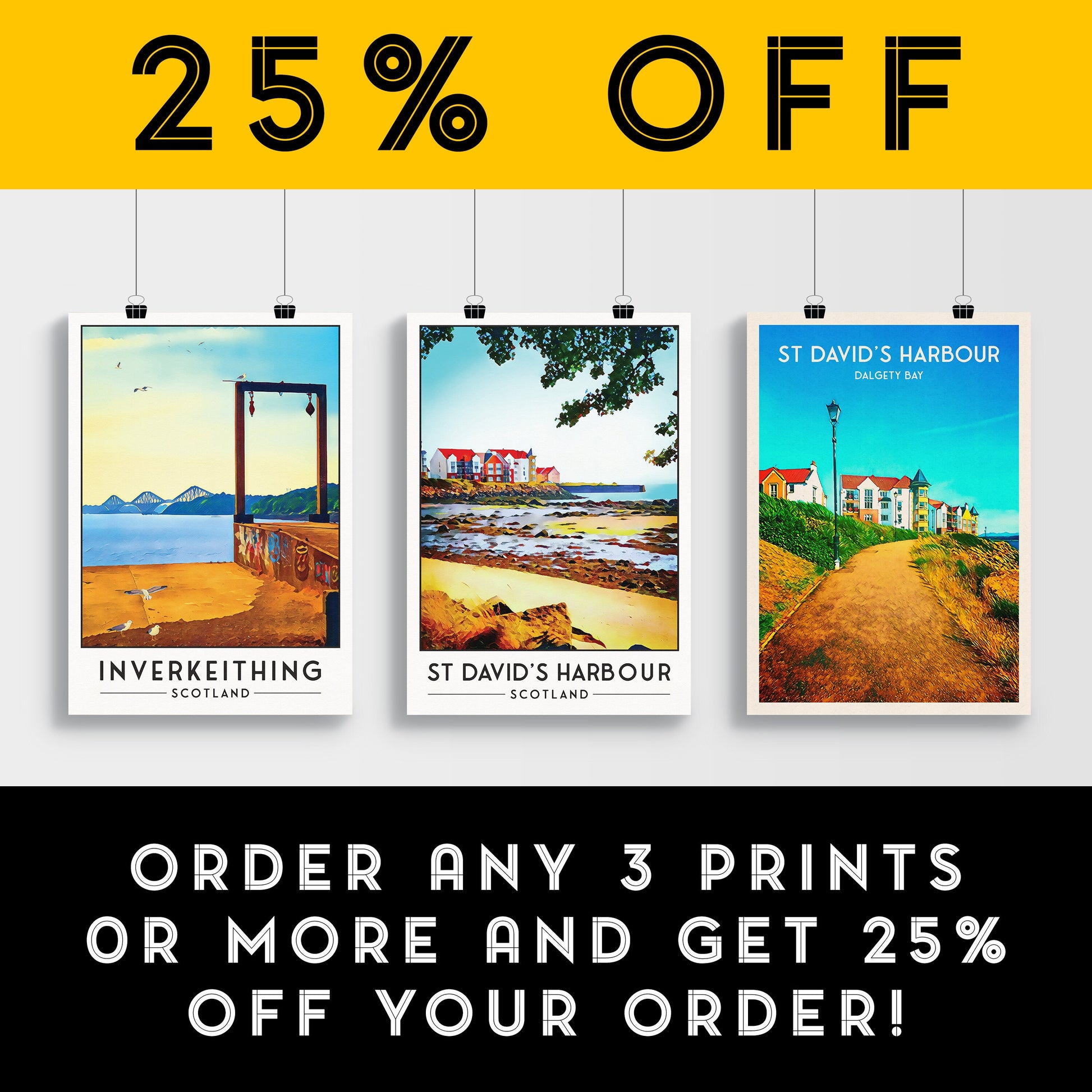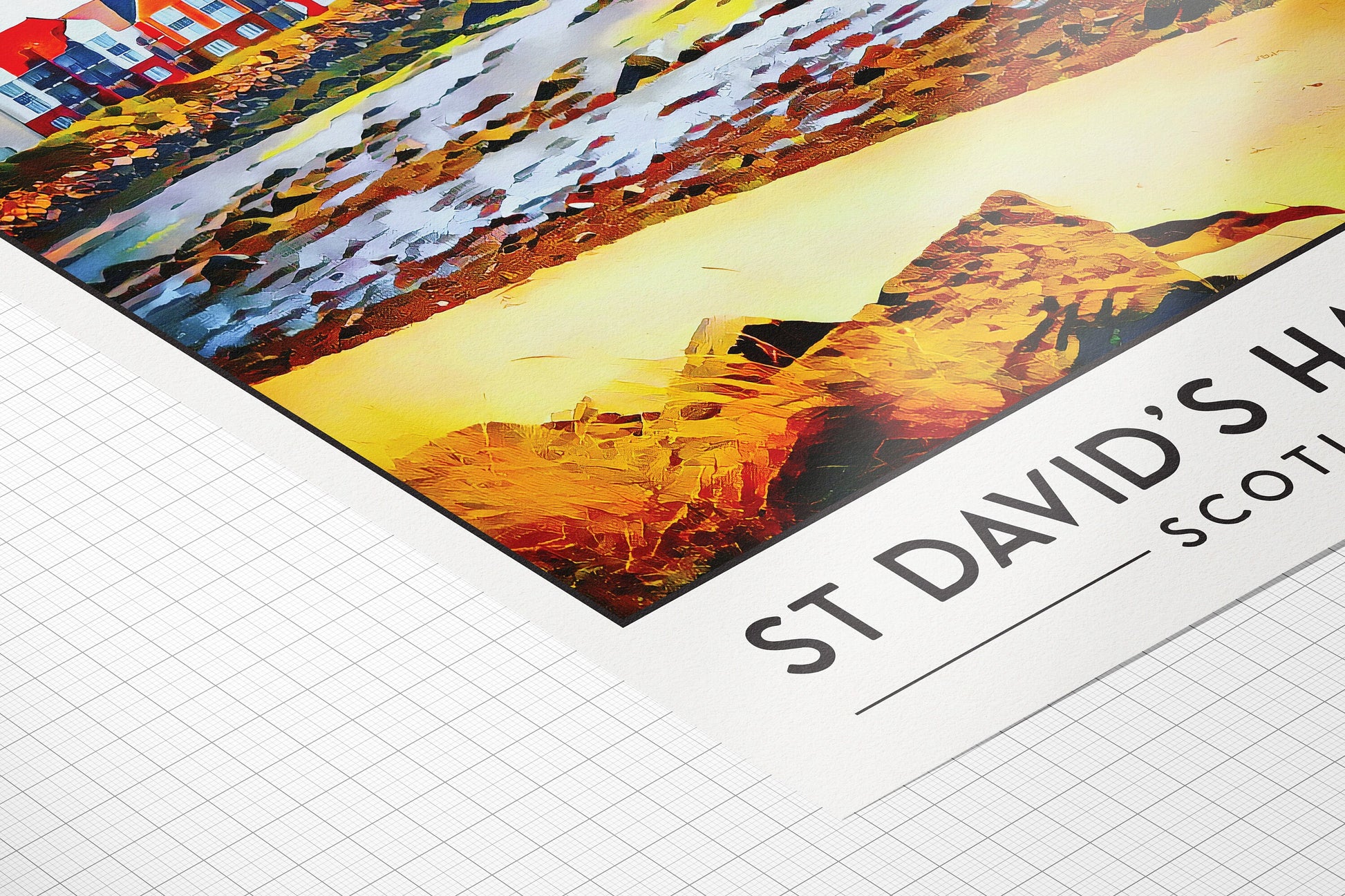 St David's Harbour PrintColourful illustration of the St David's Harbour from the path alongside the beach. It's a pleasant walk from Inverkeithing to Dalgety bay, with stunning views of the bridges. Available as:A3: 16.5 x 11.7 inches