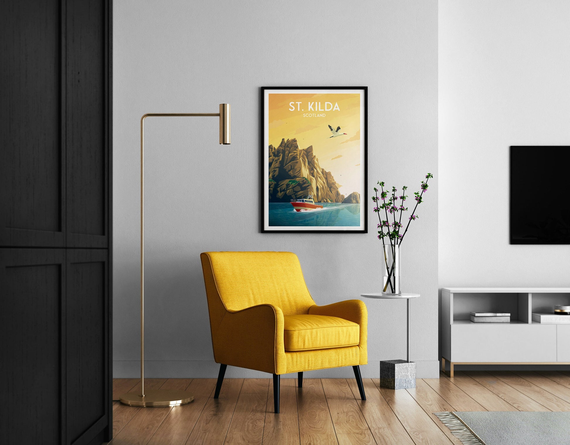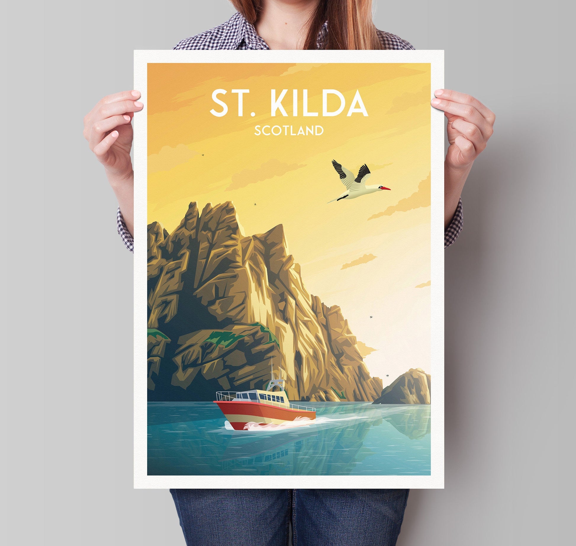 The poster showcases a striking image of Boreray Island and its towering cliffs, as well as the graceful gannet birds in flight. The poster features the a tour boat and a Gannet, one of the bird species in the region. The vibrant colors of the birds and the surrounding landscape create a captivating and vibrant scene that will transport you to the wild beauty of St Kilda.