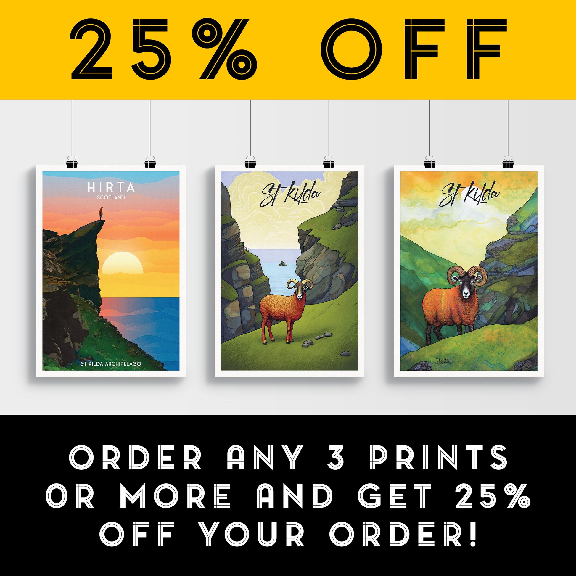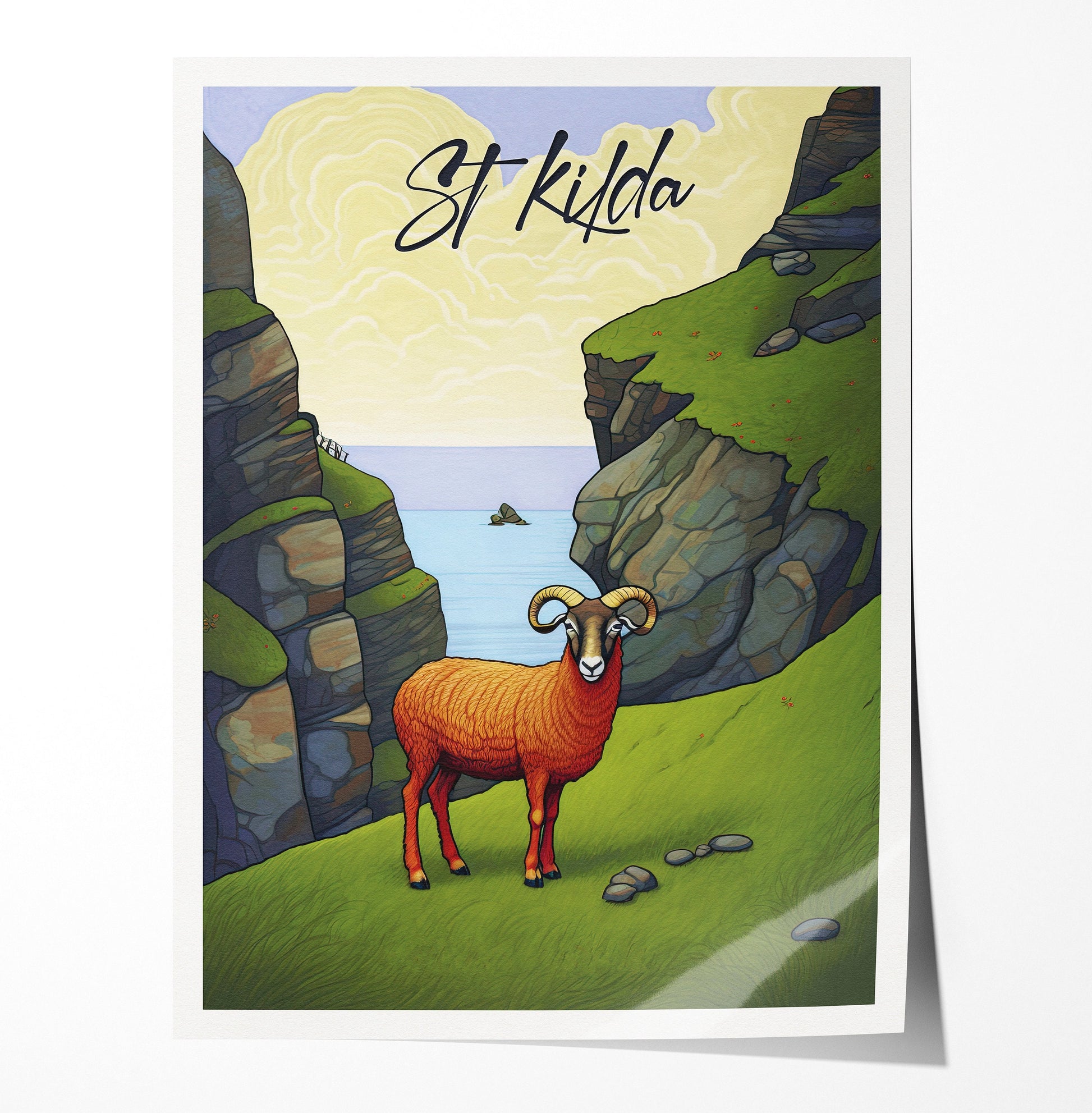 This beautiful illustration print captures the rugged beauty of St. Kilda, featuring a Soay Sheep amidst the stunning landscape. Printed on high-quality A3 or A2 paper, this print has a luxurious satin finish that adds depth and richness to the artwork.The Soay Sheep is a unique breed that has lived on the remote island of St. Kilda for over 4,000 years, and their presence adds a special charm to this illustration. This print is perfect for anyone who loves the Scottish Highlands and wants to bring a touch of nature into their home or office.Specifications:Size: A3 (11.7 x 16.5 inches) or A2 (16.5 x 23.4 inches)