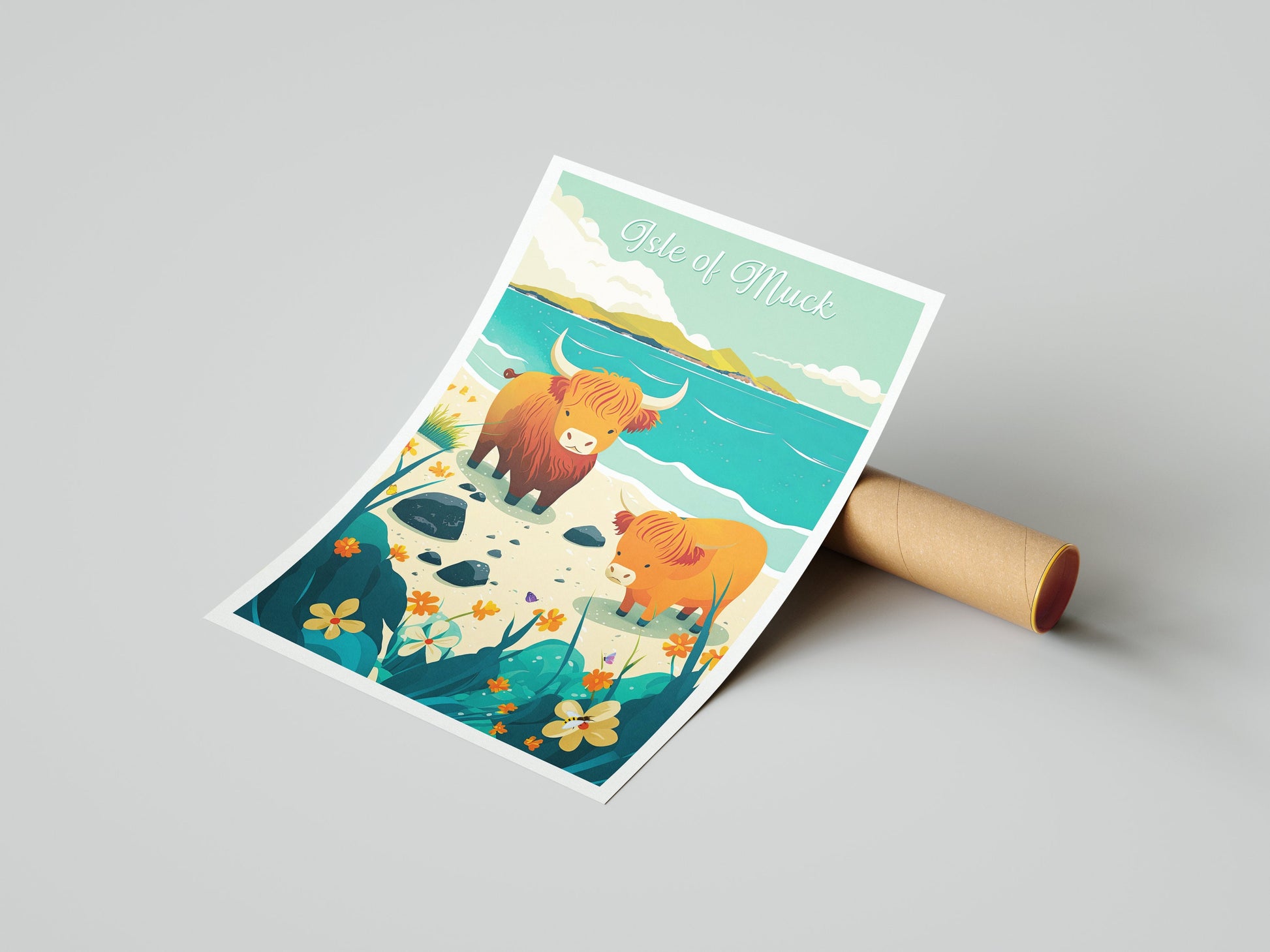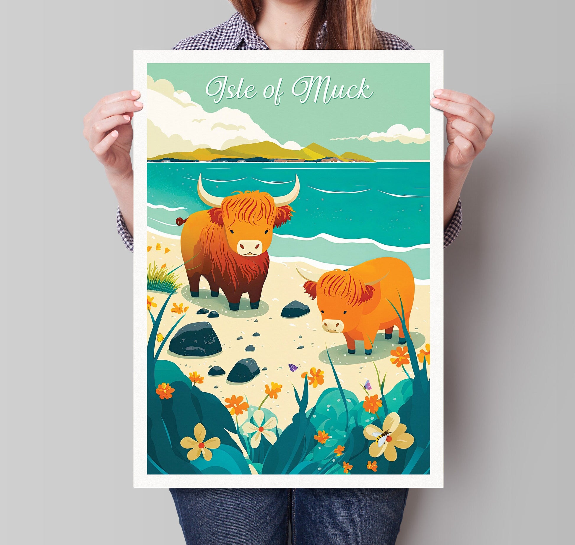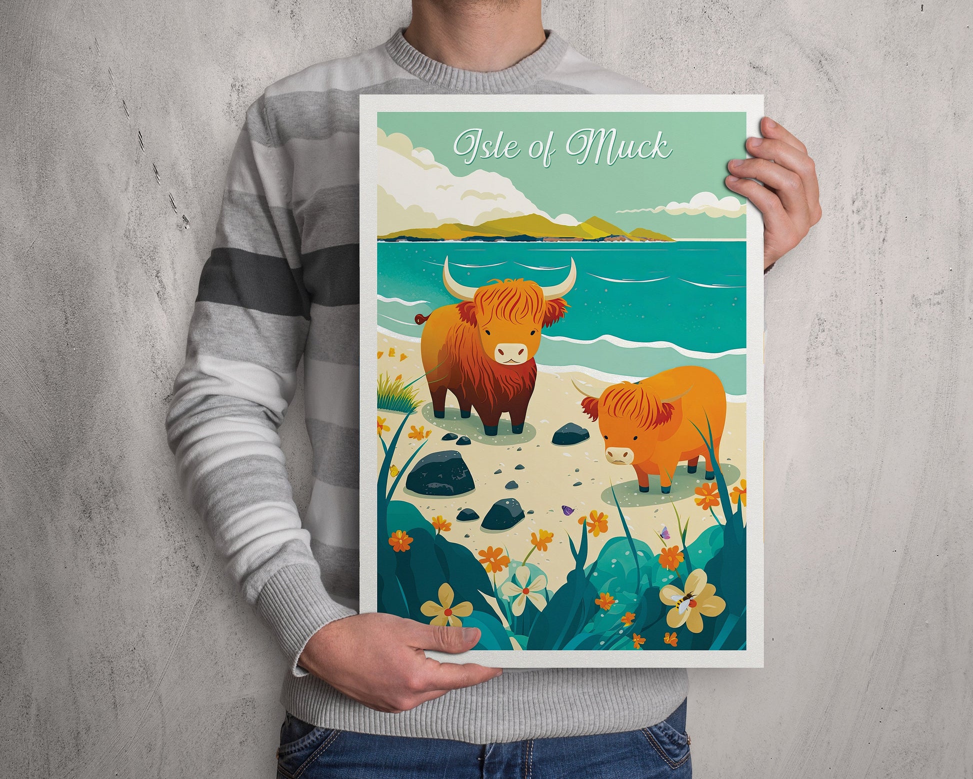 This colorful and whimsical illustration captures the charm of the Isle of Muck, Scotland, featuring two delightful Highland Cows. This print is available in two sizes: A3 or A2 and can be printed on your choice of matt or satin paper.Bring a touch of Scottish charm into your home with this lovely art print. It is the perfect addition to any room and makes a wonderful gift for anyone who loves Scotland, highland cows, or whimsical artwork. Would also look great in a children's bedroom or Nursery.Size: Available in A3 (11.7 x 16.5 inches) or A2 (16.5 x 23.4 inches)Paper Type: Choose from Matt or SatinShipping: Prints will be shipped in a sturdy cardboardtube to ensure they arrive in pristine condition.Note: Frame not included with this print.Thank you for considering this lovely print of the Isle of Muck, Scotland!SPECIAL OFFER: Buy ANY 3 Prints in my shop and get 25% OFF your orderUNIQUE PRINT: Add a touch of class to any room with this beautiful stylish decorative print. QUALITY INKS: Printed using long-lasting pigment inkARTWORK MADE TO ORDER IN THE UK: Reprint made only when you order it. FRAME READY: This unframed poster is shipped in a poly sleeve inside a thick postal tube, ensuring it is delivered crease-free. Print made to fit standard frame sizesFor more travel posters visit my etsy page:https://www.etsy.com/uk/shop/PrintagonistFor orders outside the UK please expect delivery between 2 to 4 weeks