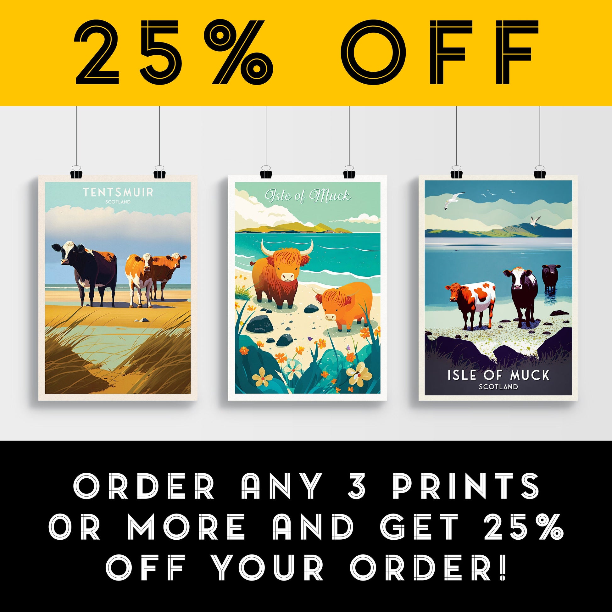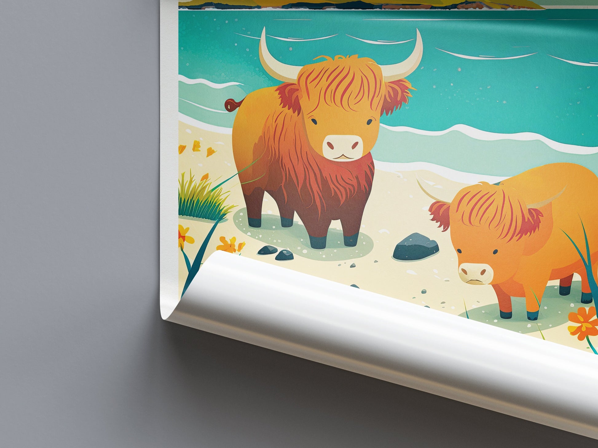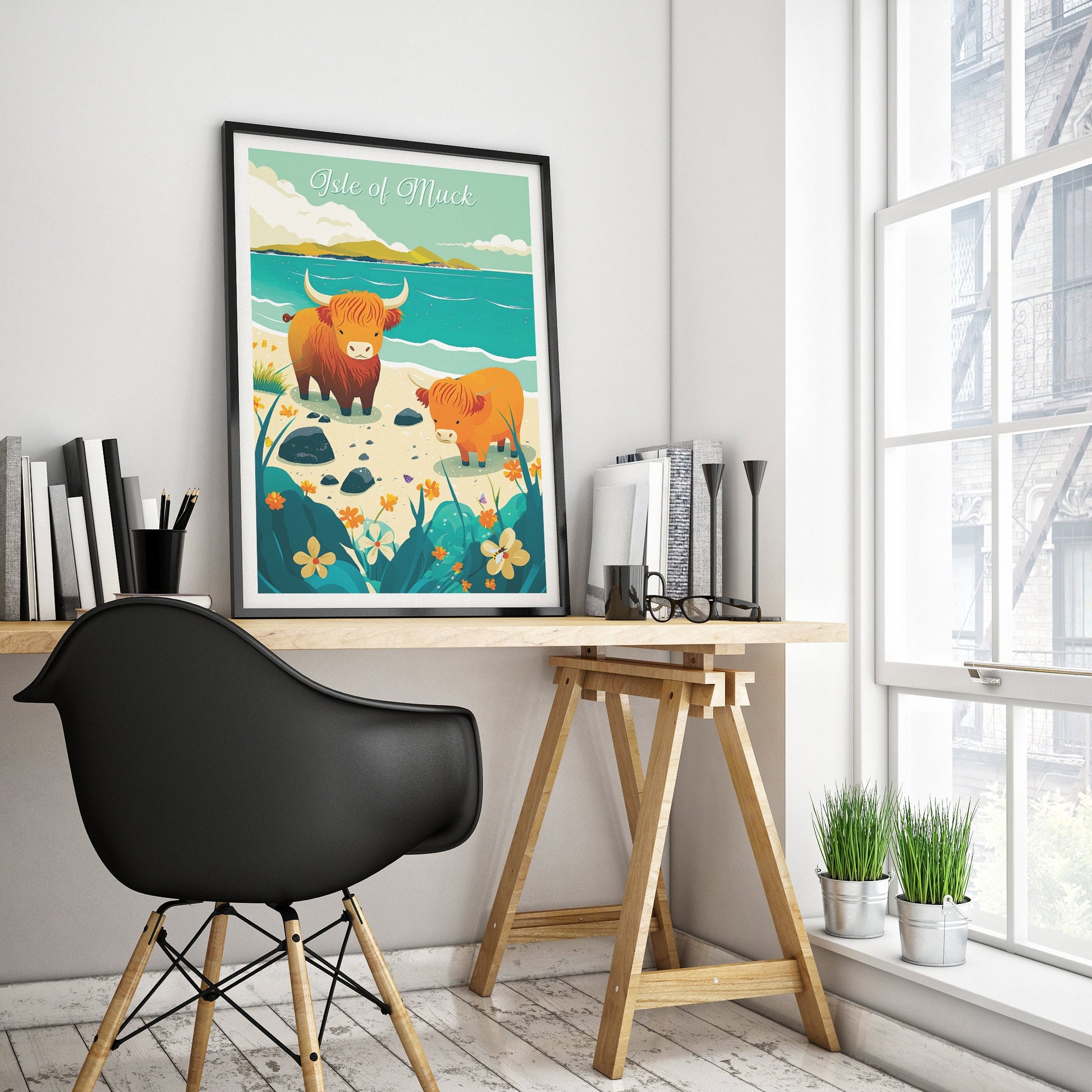 This colorful and whimsical illustration captures the charm of the Isle of Muck, Scotland, featuring two delightful Highland Cows. This print is available in two sizes: A3 or A2 and can be printed on your choice of matt or satin paper.Bring a touch of Scottish charm into your home with this lovely art print. It is the perfect addition to any room and makes a wonderful gift for anyone who loves Scotland, highland cows, or whimsical artwork. Would also look great in a children's bedroom or Nursery.Size: Available in A3 (11.7 x 16.5 inches) or A2 (16.5 x 23.4 inches)Paper Type: Choose from Matt or SatinShipping: Prints will be shipped in a sturdy cardboardtube to ensure they arrive in pristine condition.Note: Frame not included with this print.Thank you for considering this lovely print of the Isle of Muck, Scotland!SPECIAL OFFER: Buy ANY 3 Prints in my shop and get 25% OFF your orderUNIQUE PRINT: Add a touch of class to any room with this beautiful stylish decorative print. QUALITY INKS: Printed using long-lasting pigment inkARTWORK MADE TO ORDER IN THE UK: Reprint made only when you order it. FRAME READY: This unframed poster is shipped in a poly sleeve inside a thick postal tube, ensuring it is delivered crease-free. Print made to fit standard frame sizesFor more travel posters visit my etsy page:https://www.etsy.com/uk/shop/PrintagonistFor orders outside the UK please expect delivery between 2 to 4 weeks