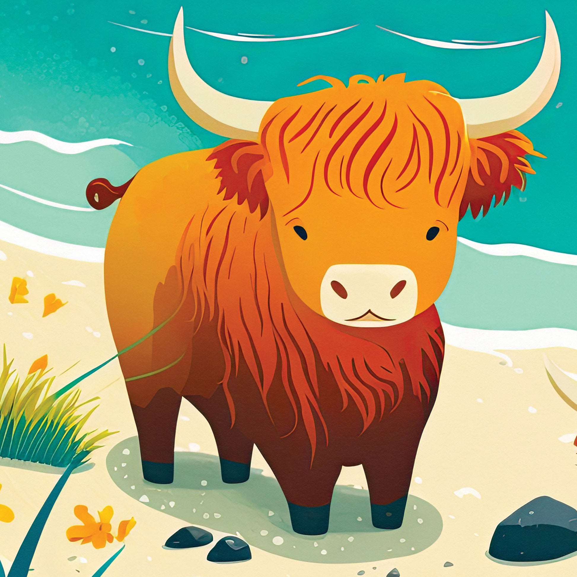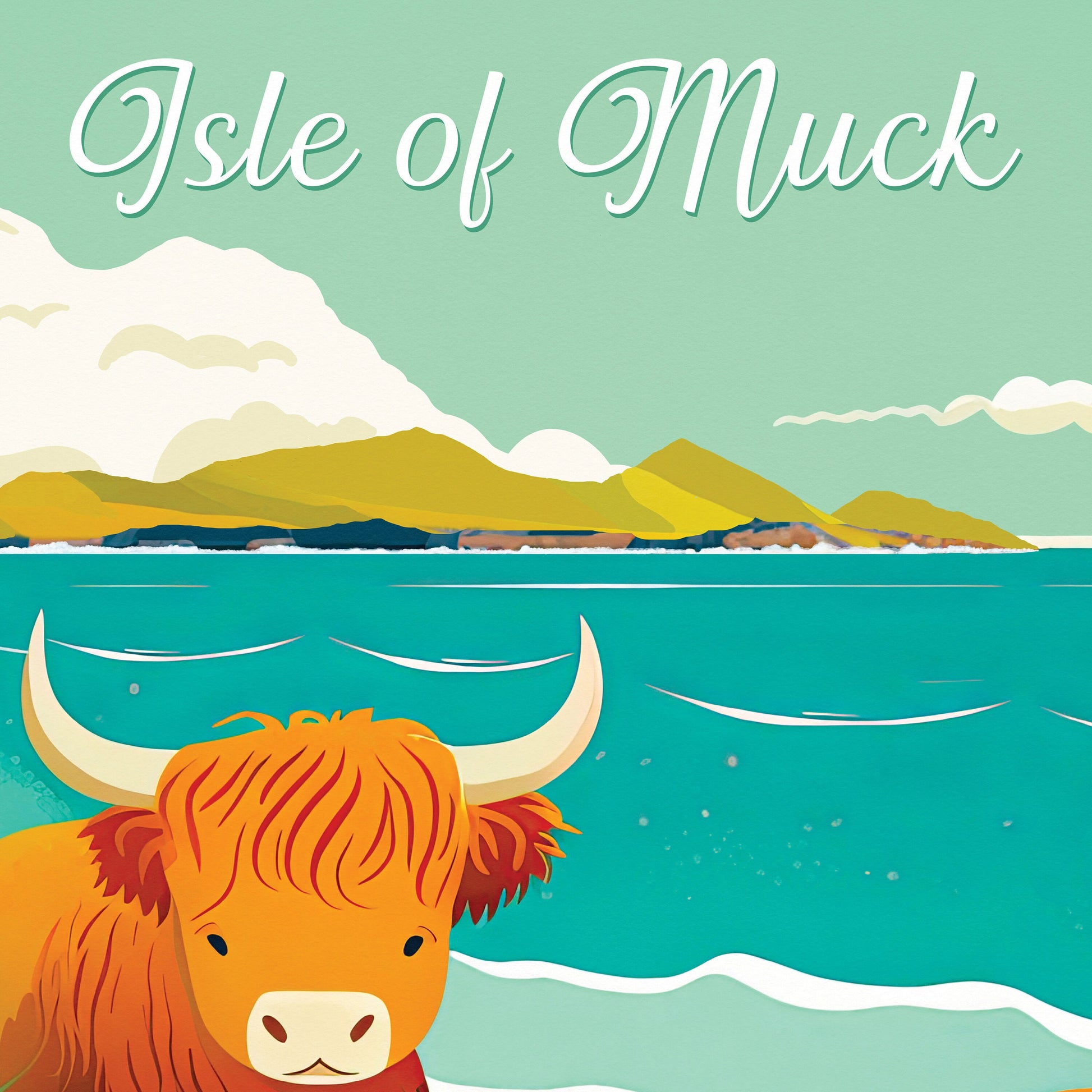 Whimsical Highland Cows on the Isle of Muck - Travel Poster - Scottish Coastal Illustration Print - Scottish Wall Art - Poster - Highlands