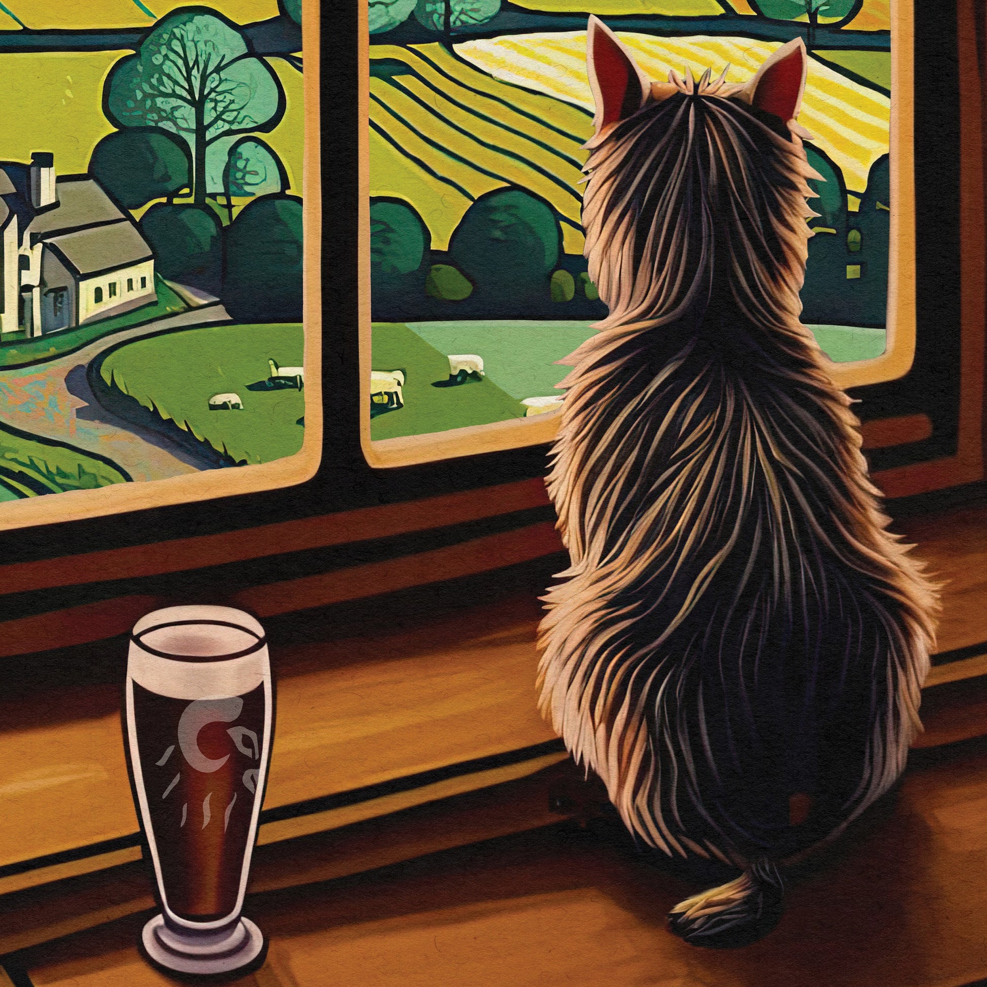 An illustration of a Yorkshire terrier looking at the the dales from a room with a view.