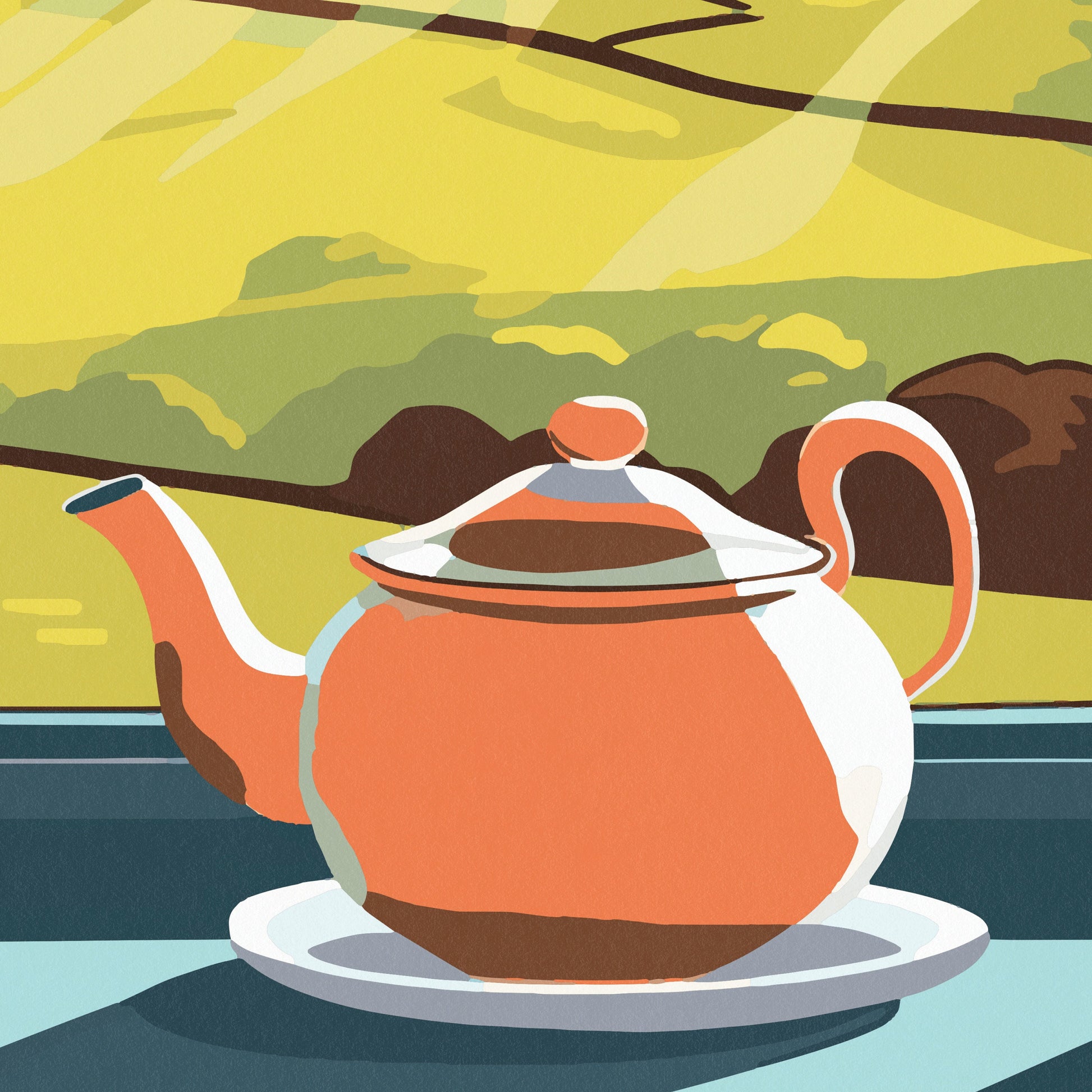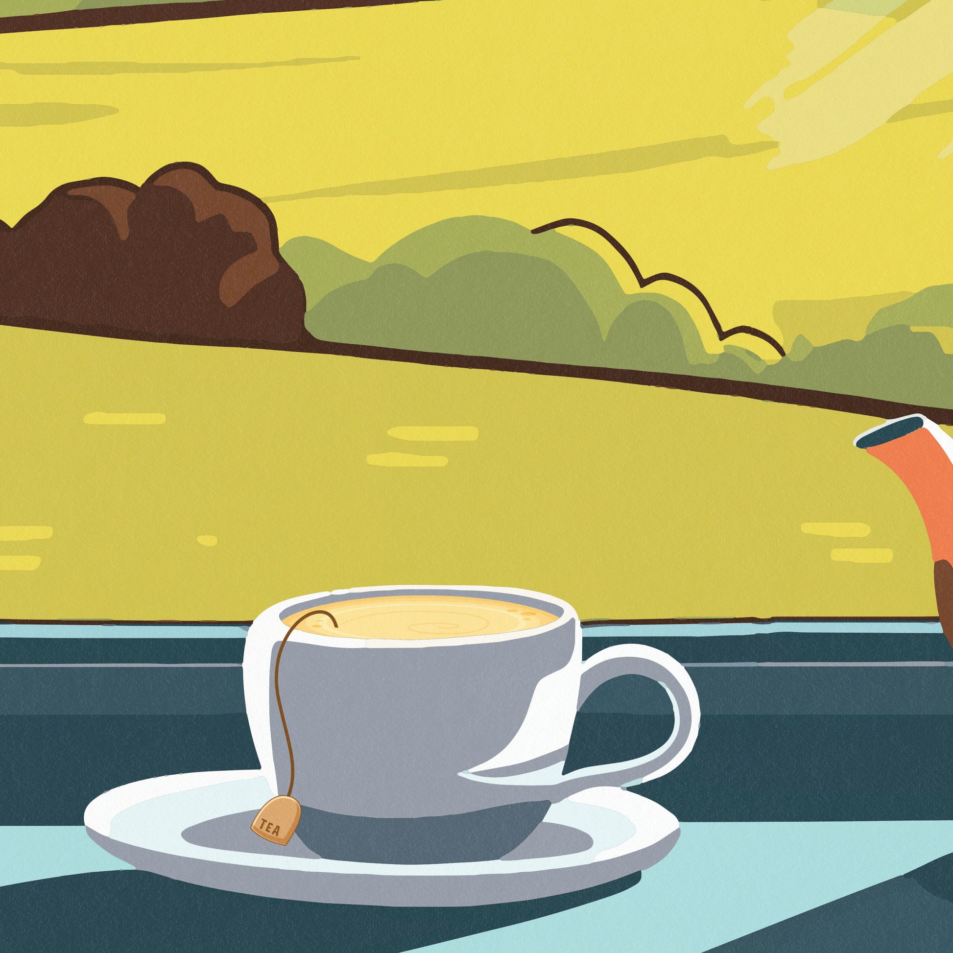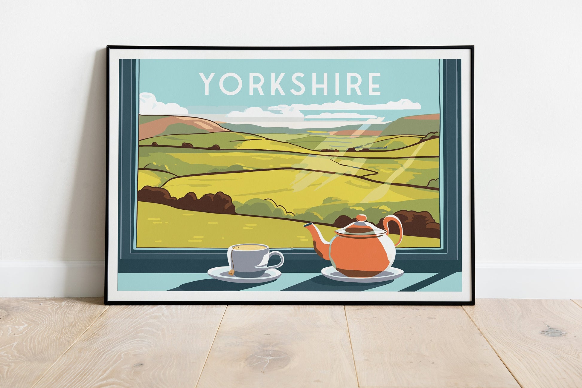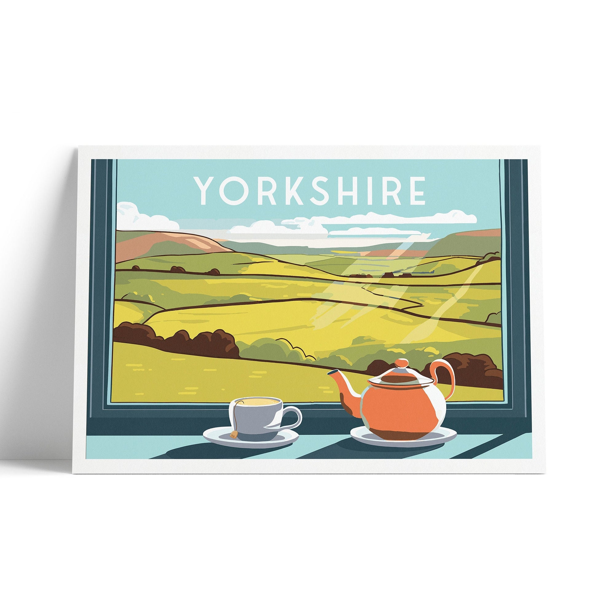 Indulge in the warmth and charm of Yorkshire with our delightful travel poster. Featuring a cozy teapot and a cup of tea, set against the backdrop of a captivating view of the Yorkshire Dales from a window, this artwork embodies the essence of this picturesque region. Transport yourself to the tranquil beauty of Yorkshire and embrace the soothing atmosphere of tea time.